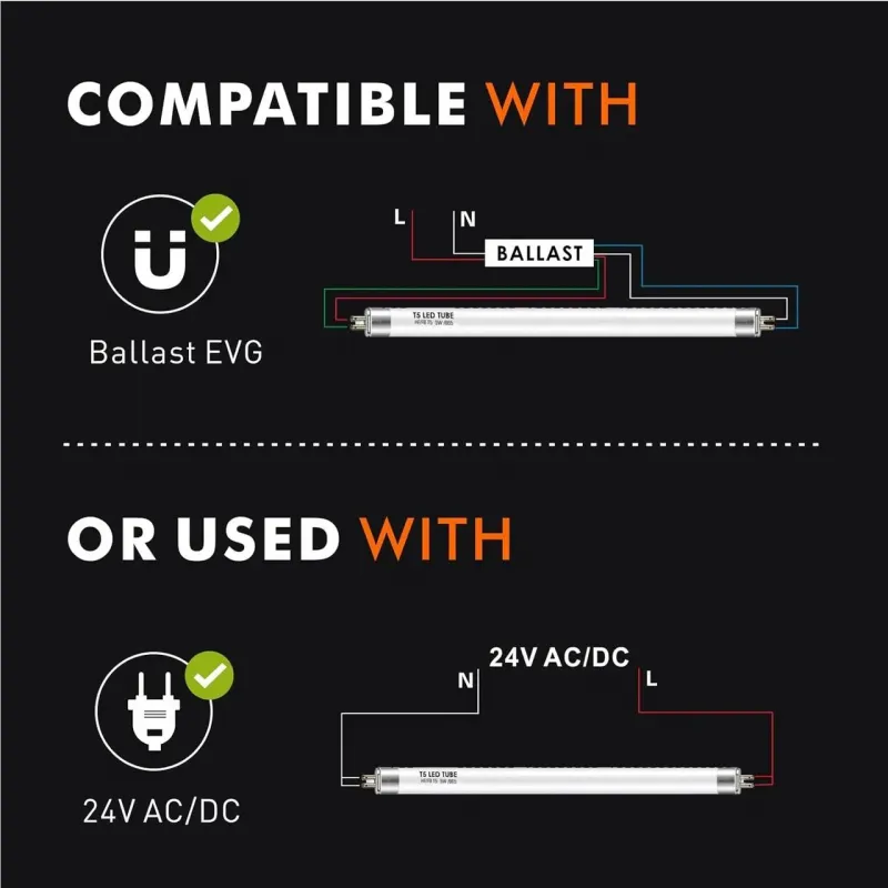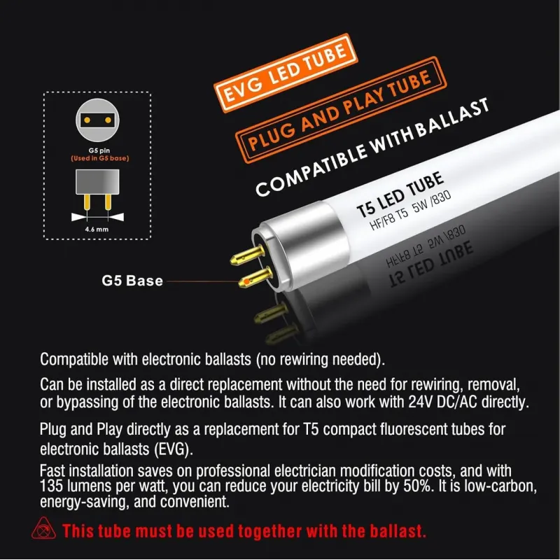 Енергозбереження: світлодіодна заміна звичайних люмінесцентних ламп T5 з цоколем G5 у лампах EVG. Заощадьте витрати на професійних електриків та 50% на рахунках за електроенергію завдяки легкому встановленню.