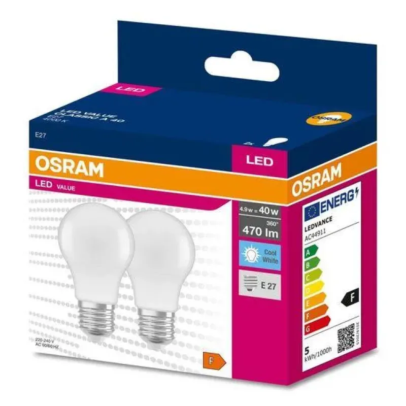 опис2PAK LED лампа E27 A60 4.9W = 40W 470lm 2700K Тепло 200° OSRAM VALUE