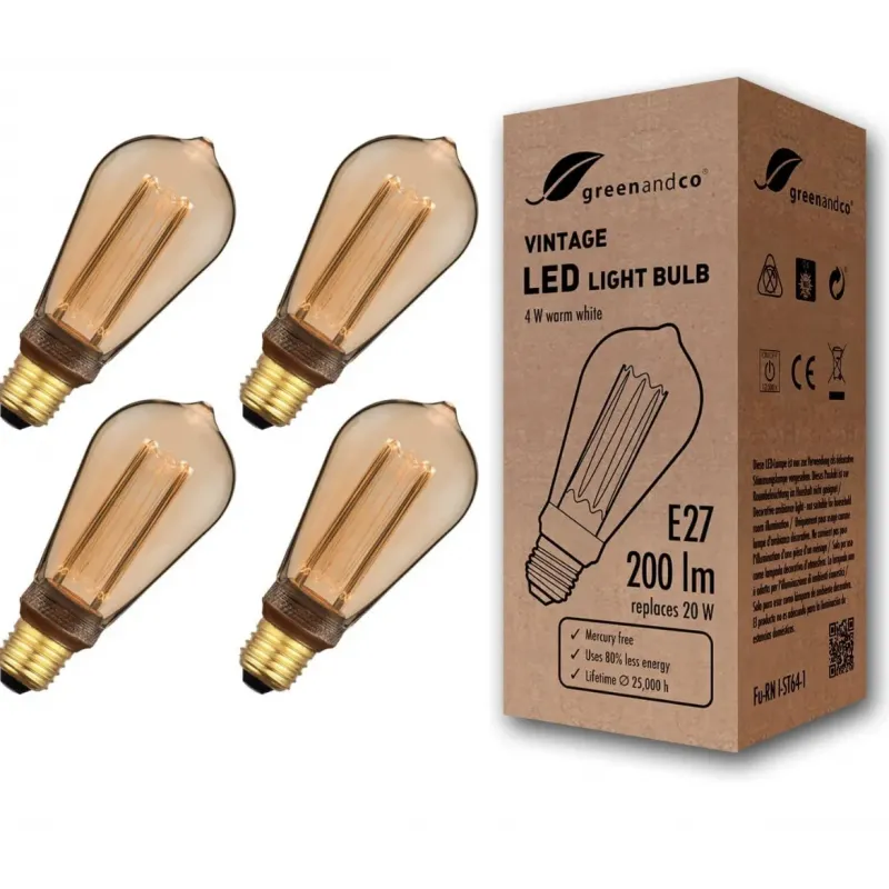 Ця вінтажна світлодіодна лампа Greenandco з унікальною запатентованою технологією забезпечує дивовижний ефект завдяки лазерній колбі з плексигласу, яка відбиває світло і тому має вигляд як історична лампа розжарювання.  Водночас тільки світлодіодам, розташованим у землі, потрібно лише 2 або 4 Вт.