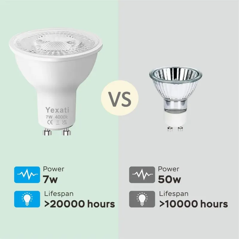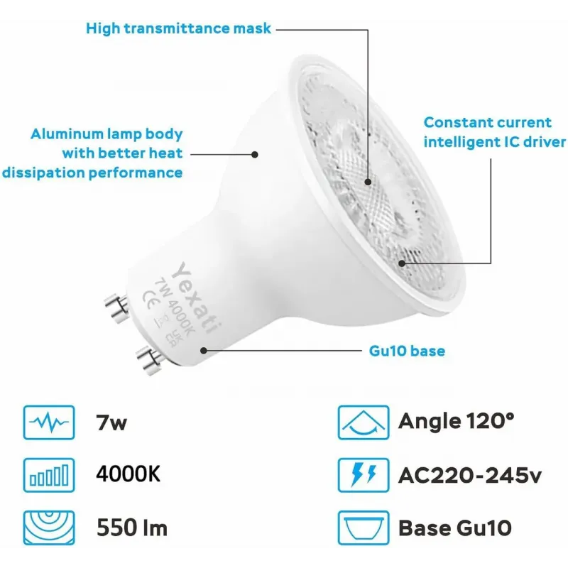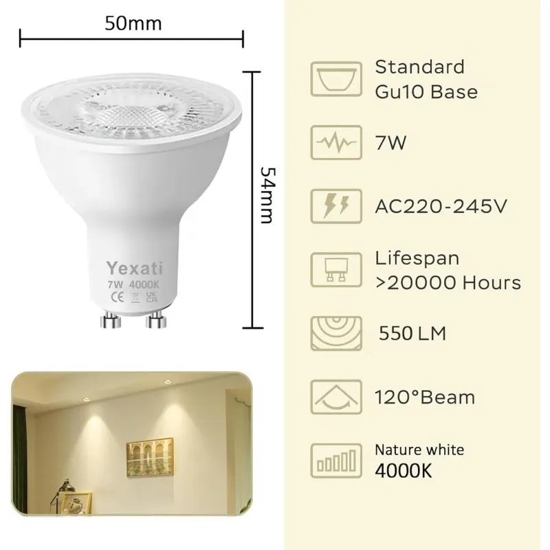 Світлодіодна лампа Yexati LED GU10 7 Вт 550 лм нейтральне біле світло 4000K набір 10 шт для точкового освітлення