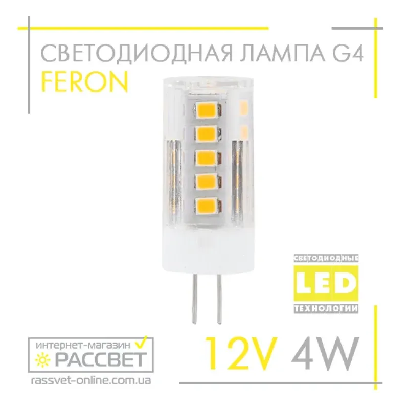 Світлодіодна LED лампа Feron LB-423 12V G4 4W 320Lm (12В 4Вт) капсула в люстру 16х43мм нейтральне світло 4000K