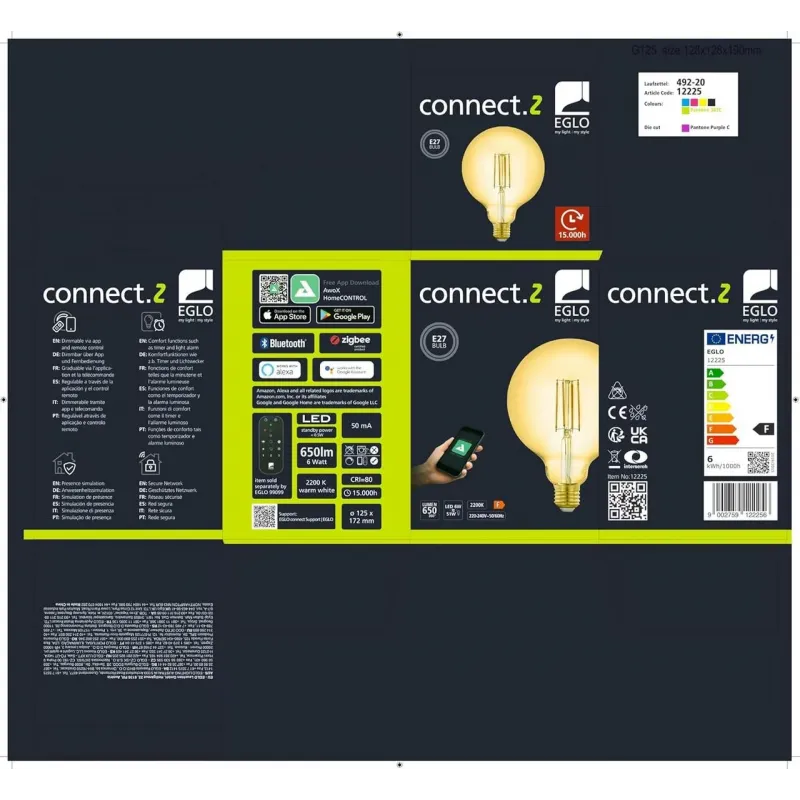 Світлодіодна смарт-лампа Eglo Connect.z G125 E27 поєднує класичний вінтажний дизайн з сучасними функціями розумного дому. Модель підтримує протокол ZigBee, що дозволяє керувати освітленням через мобільний додаток або голосові асистенти, включно з Alexa. Лампа випромінює теплий білий світ 650 лм, забезпечуючи приємну та комфортну атмосферу в приміщенні. Потужність лише 6 Вт, що робить її економічною та енергоефективною. Завдяки формату G125 та колбі бурштинового відтінку, лампа додає інтер’єру стильного ретро-акценту. Регульована яскравість дає можливість створювати затишне або функціональне освітлення, залежно від потреб користувача.