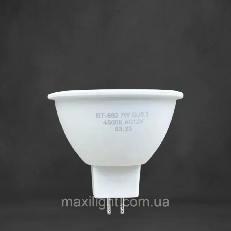 Дана світлодіодна лампа має цоколь типу GU5.3 і сплощену рефлекторну форму колби, що відповідає стандарту MR16. Потужність цієї моделі становить 7 Вт, а колірна температура її світіння дорівнює 4500 К, тобто, належить до нейтрально-денної частини спектра. Робочий вольтаж виробу – 12 В постійного/змінного струму. Лампа виготовлена ​​зі спеціального пластика підвищеної міцності, розсіювач має матове напилення. Модель підійде для установки у стельові світильники, які застосовуються у офісних приміщеннях і у сфері торгівлі. Лампа може експлуатуватися у будь-яких приміщеннях при дотриманні нормального температурного режиму (оптимальні умови – від -10°С до +40°С).