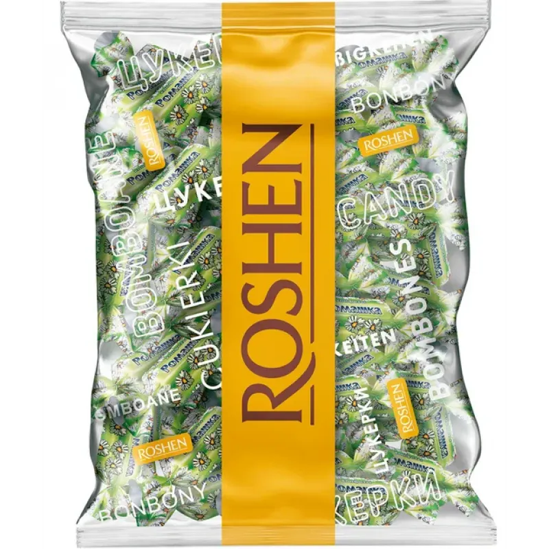 • **Індивідуальна упаковка:** Кожна цукерка герметично запакована в біло-зелену обгортку з зображенням ромашки та логотипом Roshen, що зберігає її свіжість та аромат.