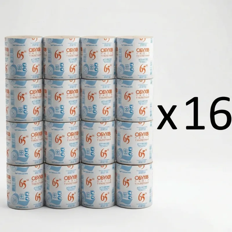 Комплект "Обухів 65" (16 рулонів) — це вибір тих, хто цінує суть, а не форму. Це справжня "важка артилерія" на ринку гігієни. Візьміть цей рулон у руку, і ви відчуєте різницю — він важкий, твердий і наповнений папером на всі 100%.
