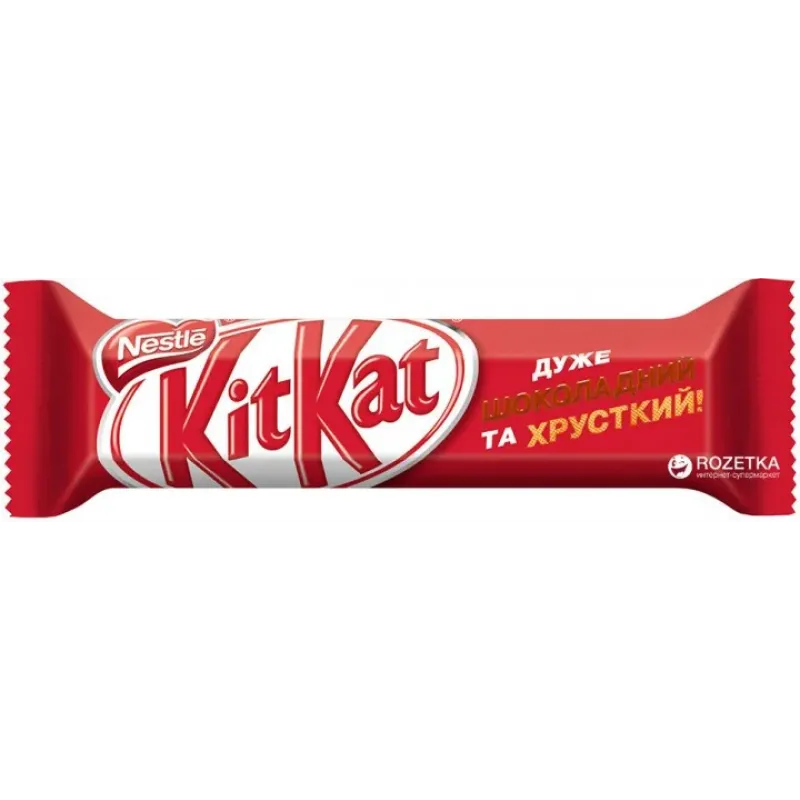 КІТКАТ® вафлі в ніжному молочному шоколаді прекрасно підходять для тих, хто дійсно цінує свої перерви. Просто розгорни KITKAT®, зріж шматочок і насолоджуйся ніжним молочним шоколадом і хрусткою вафелькою. Є перерва, є КИТКАТ®. Состав: сахар, молоко сухое обезжиренное, мука пшеничная, какао-масло, жир пальмовый, какао тертое, масло сливочное, сыворотка молочная сухая, обезжиренный какао порошок, эмульгатор (лецитин подсолнечный), ароматизаторы, соль поваренная, разрыхлитель теста (бикарбонат натрия). Может содержать арахис и орехи. Пищевая ценность (на 100 г): белки — 7.7 г, жиры — 28.6г , углеводы — 59.5 г.