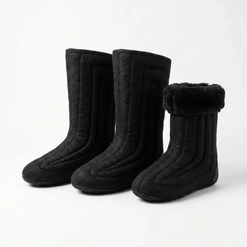 Універсальні чорні шиті валянки (бурки) — найтепліше рішення для зими. Ця модель повністю виконана в практичному чорному кольорі, включаючи внутрішній утеплювач, що робить її ідеальною для щоденного використання — хутро не брудниться і довше зберігає охайний вигляд. Верх виготовлено зі щільного прошитого матеріалу, що нагадує повсть, який надійно зберігає тепло. Усередині — густе та тепле чорне штучне хутро. Для додаткової зносостійкості п'ята посилена вставкою зі шкірозамінника, що захищає валянки від протирання та вологи. Підошва м'яка, прошита, забезпечує комфортну ходьбу як у приміщенні, так і на вулиці в суху погоду. Характеристики: Тип взуття: Шиті валянки / Бурки Розміри: 38 - 45 (Унісекс) Колір верху: Чорний Утеплювач: Штучне хутро (Чорне) Особливості: Посилена п'ята, практичний чорний колір, прошита підошва Сезон: Зима