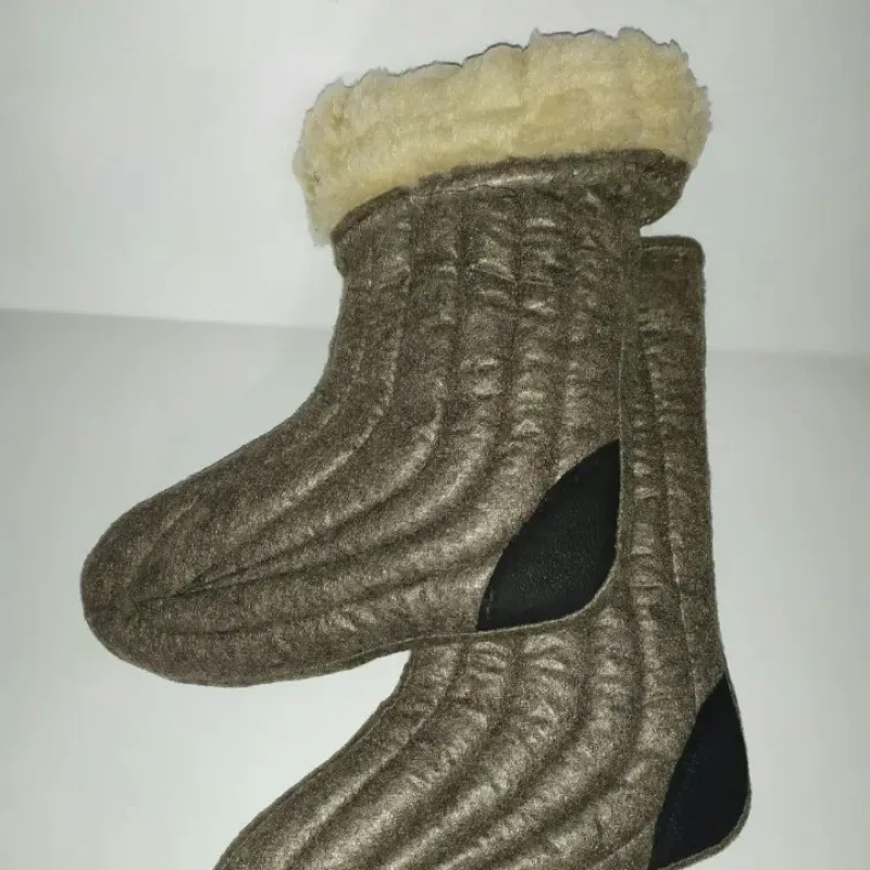 Дуже теплі та м'які стьобані валянки без калош — ідеальне рішення для тих, у кого мерзнуть ноги. Це повноцінне кімнатне взуття, яке працює за принципом "термоса", зберігаючи тепло тіла всередині. Такі валянки купують для носіння вдома (особливо якщо холодна підлога), на дачі, а також як взуття для сну в погано опалюваних приміщеннях. Особливості моделі: Матеріал: Щільна стьобана тканина з наповнювачем, яка не пропускає холод. Утеплення: Всередині густе та м'яке штучне хутро світлого кольору. Посилена п'ята: Задня частина захищена накладкою зі шкірозамінника, що значно подовжує термін служби валянок і запобігає їх протиранню об підлогу. Комфорт: Валянки невагомі, м'які, ніде не тиснуть і легко взуваються. Характеристики: Тип: Валянки кімнатні (без підошви) Матеріал верху: Текстиль стьобаний Утеплювач: Штучне хутро Колір: Золотистий / Бронза (металік) Особливість: Посилений задник Призначення: Дім, дача, сон