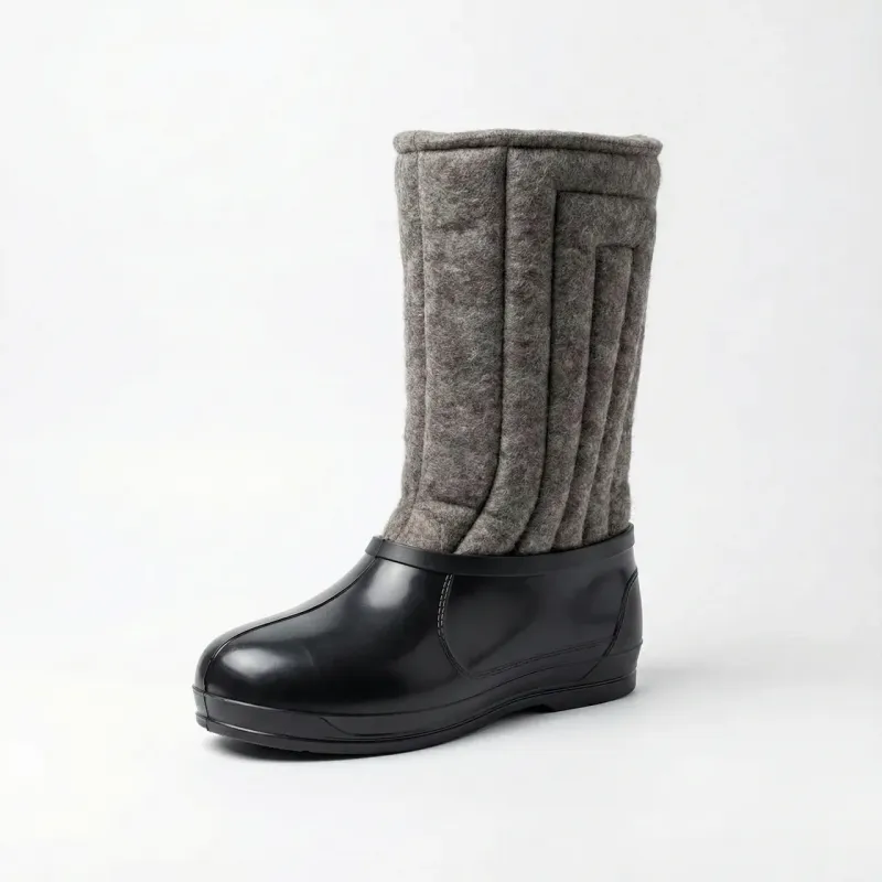 Класичні високі валянки. Низ — суцільнолита водонепроникна калоша (ПВХ). Верх — тепле стьобане сукно (повсть). Без застібок. Дуже теплі. Виробництво Україна. Повний опис: Ці високі зимові бурки — це перевірена часом класика, яка рятує в найлютіші морози. Модель поєднує в собі тепло традиційного валянка та практичність гумових чобіт. Низ взуття ("калоша") виготовлений з морозостійкого ПВХ, який не тріскається на холоді та на 100% захищає від води та сльоти. Халява висока, пошита з багатошарового утепленого сукна (повсті) зі стьобаною фактурою, що створює повітряну подушку для збереження тепла. Чому це взуття — лідер продажів для зими: Максимальне тепло: Висока халява гріє не тільки стопу, а й гомілку. Захист від снігу: У таких чоботях можна сміливо йти по кучугурах — сніг не потрапить всередину. Універсальність: Розмірна сітка 38-45 дозволяє взути і бабусю, і дідуся, і підлітка. Простота: Ніяких блискавок чи шнурків, які можуть зламатися. Просто взув і пішов. Характеристики: Виробник: Україна Тип: Бурки високі / Валянки / Бабуші Матеріал низу: ПВХ (гума) Матеріал верху: Стьобана повсть (сукно) Застібка: Без застібки (Pull-on) Колір: Чорний низ / Сірий верх Сезон: Зима Розміри: 38, 39, 40, 41, 42, 43, 44, 45