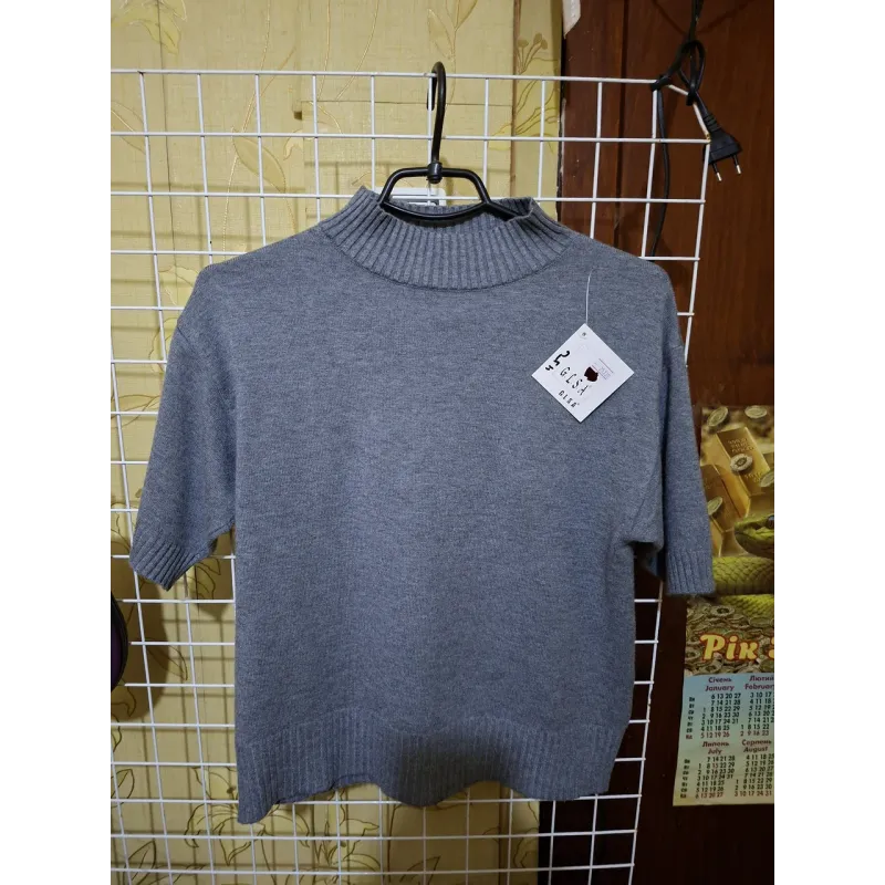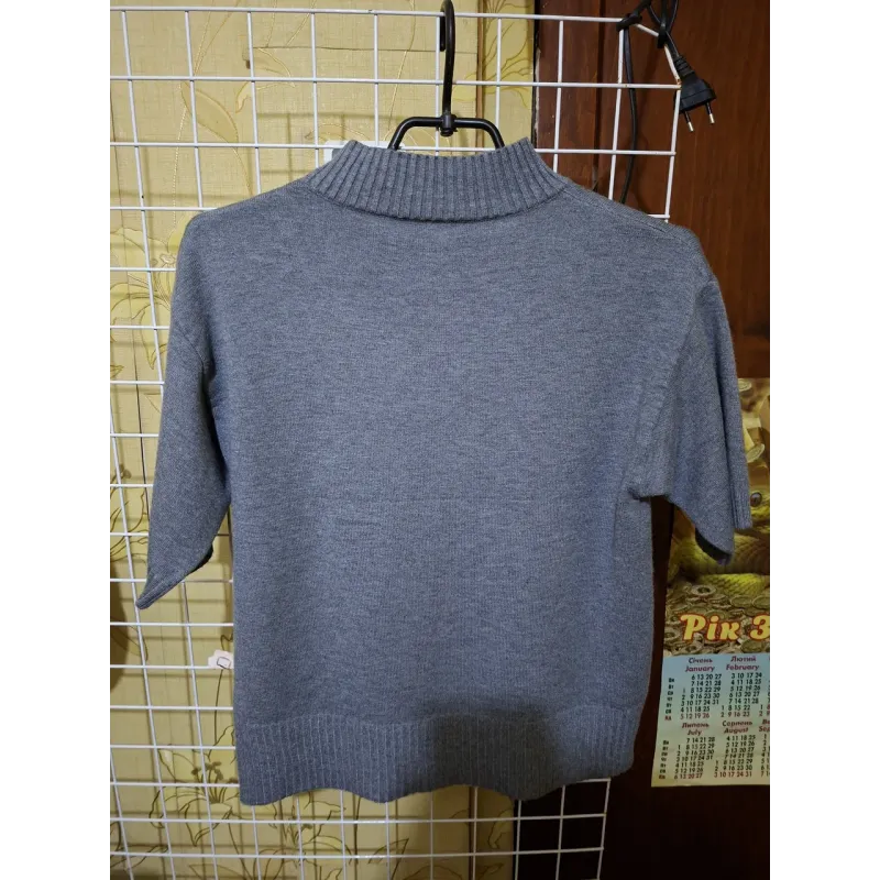 Створіть бездоганний діловий або повсякденний образ із новою сірою кофтою-"американкою" від бренду GLSA. Це універсальна річ, яка поєднує в собі елегантність гольфу та комфорт футболки. Модель ідеально підходить на розміри 48-50, гарно сідає по фігурі, не обтягуючи її занадто сильно. Особливості моделі: Високий комір: Акуратна горловина-стійка візуально подовжує шию та додає образу стриманості. Це чудовий варіант під піджак, кардиган або жилетку, оскільки шия залишається закритою. Рукав 1/2: Рукав довжиною до ліктя з манжетом-резинкою приховує верхню частину руки, що додає впевненості та комфорту. Універсальний колір: Класичний сірий відтінок легко поєднується з будь-яким низом — від чорних брюк до яскравих спідниць чи джинсів. Светр виконаний з м'якого трикотажу машинної в'язки. Низ виробу також оформлений широкою резинкою, що дозволяє носити кофту як навипуск, так і заправленою. Характеристики: Бренд: GLSA Розмір: 48-50 Колір: Сірий Рукав: Короткий (до ліктя) Горловина: Стійка (під горло) Сезон: Весна / Осінь / Зима (під одяг)