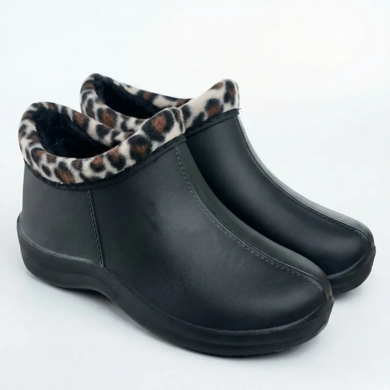 Стиль та тепло у кожному кроці, навіть коли на вулиці сльота! Представляємо оригінальну модель жіночих утеплених калош (коротких чобітків) у практичному чорному кольорі. Головна родзинка цієї пари — пухнастий хутряний кант із трендовим леопардовим принтом. Це взуття доводить, що працювати на подвір'ї чи відпочивати на дачі можна з максимальним комфортом та жіночністю.