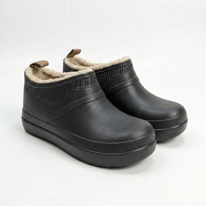 Абсолютна практичність, поєднана з домашнім затишком! Представляємо нову класичну модель жіночих утеплених калош (низьких сабо) у базовому чорному кольорі. Головна родзинка цієї пари — стильний рельєфний кант у рубчик у верхній частині та контрастне світло-бежеве хутро всередині. Це ідеальне та надійне взуття для повсякденних господарських справ у прохолодну пору року.