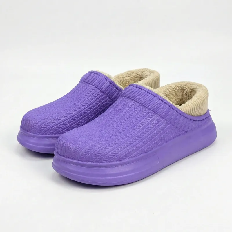 Створіть свій ідеальний домашній затишок у яскравих барвах! Представляємо надзвичайно красиву та комфортну модель жіночих утеплених калош (низьких сабо) у чудовому бузковому (лавандовому) кольорі. Головна особливість цієї пари — унікальний рельєф поверхні, що імітує об'ємну машинну в'язку. Завдяки такому свіжому відтінку та контрастному світло-бежевому вельветовому канту в рубчик, ці калоші виглядають як неймовірно стильні та розкішні домашні капці.