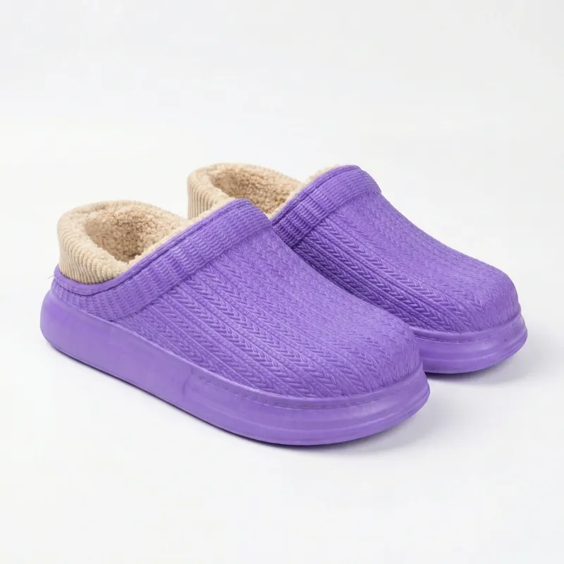 Створіть свій ідеальний домашній затишок! Представляємо надзвичайно ніжну та комфортну модель жіночих утеплених калош (низьких сабо) у чудовому фіолетовому (бузковому) кольорі. Головна особливість цієї пари — унікальний рельєф поверхні, що імітує об'ємну машинну в'язку. Завдяки такому благородному відтінку та контрастному світло-бежевому вельветовому канту в рубчик, ці калоші виглядають як неймовірно стильні та розкішні домашні капці.