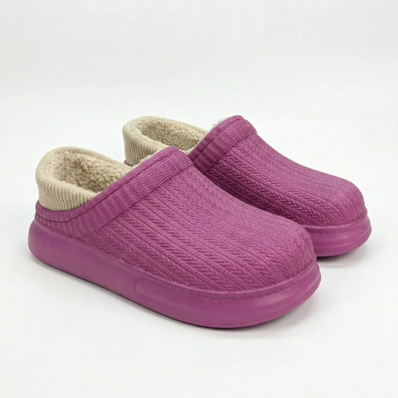 Естетика та домашній затишок, які завжди з вами! Представляємо надзвичайно стильну та комфортну модель жіночих утеплених калош (низьких сабо). Головна особливість цієї пари — унікальний рельєф поверхні, що імітує об'ємну машинну в'язку. Модель доступна одразу у чотирьох трендових відтінках: глибокому темно-зеленому (хакі), ніжному бежевому, насиченому фіолетовому та соковитому яскраво-рожевому (малиновому). Завдяки такому дизайну та м'якому вельветовому канту в рубчик, калоші виглядають зовсім не як робоче взуття, а як розкішні домашні капці.