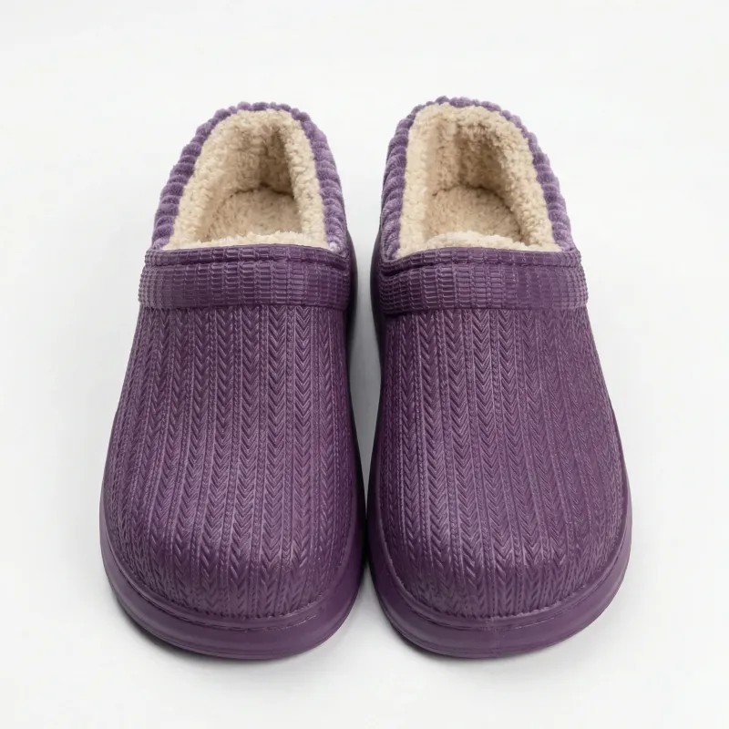 Естетика та затишок, які завжди з вами! Представляємо надзвичайно стильну та комфортну модель жіночих утеплених калош (низьких сабо). Головна особливість цієї пари — унікальний рельєф поверхні, що імітує об'ємну машинну в'язку. Модель доступна у трьох трендових відтінках: глибокому темно-зеленому (хакі), ніжному бежевому та насиченому фіолетовому. Завдяки такому дизайну та акуратному вельветовому канту в рубчик, калоші виглядають зовсім не як робоче взуття, а як розкішні домашні капці.