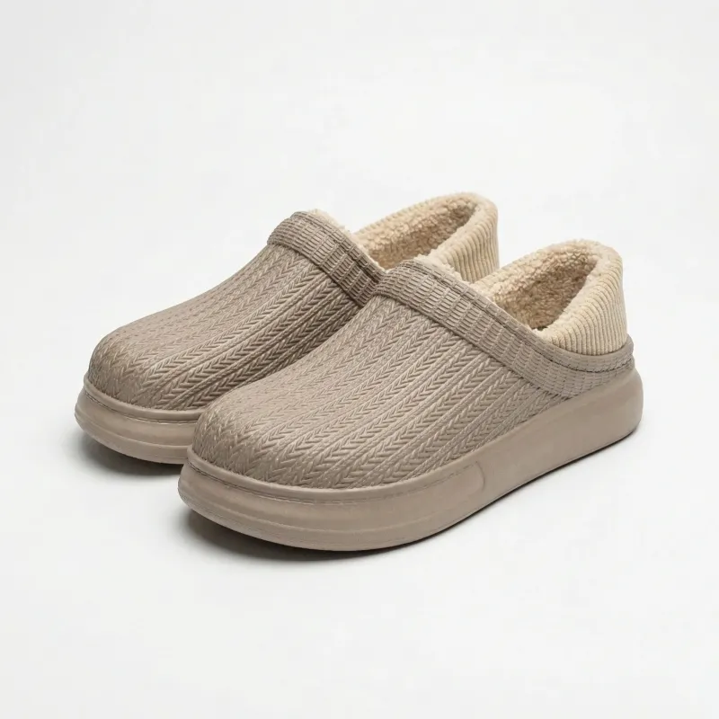 Естетика та затишок, які завжди з вами! Представляємо надзвичайно стильну та комфортну модель жіночих утеплених калош (низьких сабо). Головна особливість цієї пари — унікальний рельєф поверхні, що імітує об'ємну машинну в'язку. Модель доступна у двох найбільш трендових та спокійних відтінках: глибокому темно-зеленому (хакі) та ніжному бежевому. Завдяки такому дизайну та акуратному текстильному канту в рубчик, калоші виглядають зовсім не як робоче взуття, а як розкішні домашні капці.