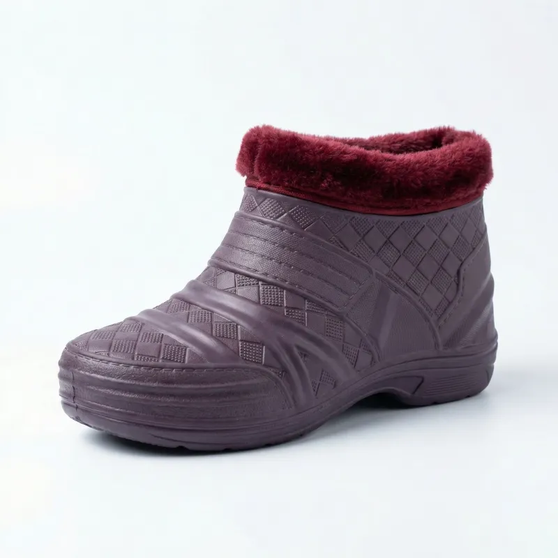 Забудьте про холодні та мокрі ноги під час господарських справ! Представляємо стильну та надзвичайно практичну модель жіночих утеплених калош у красивому сливовому (фіолетово-бордовому) кольорі. На відміну від звичайних гумових калош, ця пара має сучасний дизайн із рельєфним "стьобаним" візерунком, тому виглядає на ніжці дуже акуратно та жіночно.