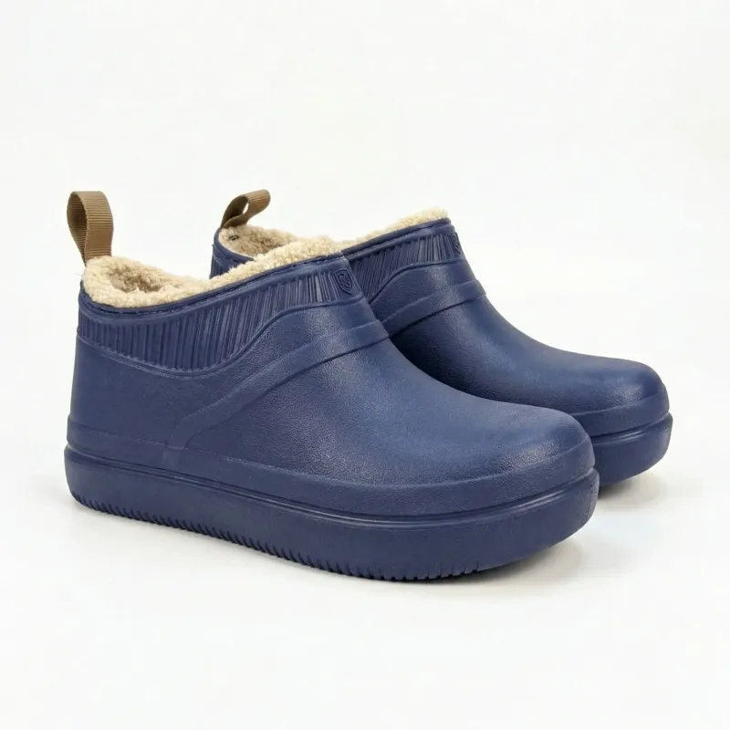 Ідеальний баланс практичності та домашнього затишку! Представляємо нову класичну модель жіночих утеплених калош (низьких сабо) у благородному темно-синьому кольорі. Головна родзинка цієї пари — стильний рельєфний кант у рубчик у верхній частині, контрастне світло-бежеве хутро всередині та зручна петелька на п'яті. Це надійне взуття для повсякденних господарських справ, яке виглядає акуратно та сучасно.