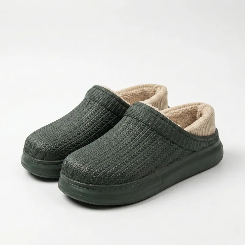 Затишок, який завжди з вами! Представляємо надзвичайно стильну та комфортну модель жіночих утеплених калош (низьких сабо). Взуття виконане у благородному темно-зеленому кольорі. Головна особливість цієї пари — унікальний рельєф поверхні, що імітує об'ємну в'язку. Завдяки цьому дизайну та акуратному текстильному канту в рубчик, калоші виглядають дуже сучасно, естетично та по-домашньому тепло.