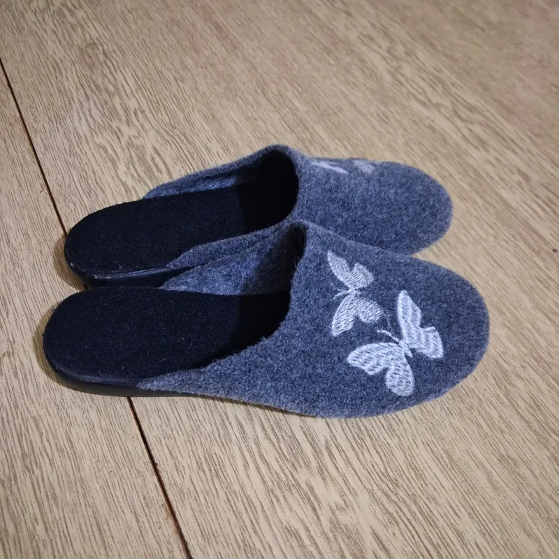 Затишні жіночі капці з повсті. Ніжна вишивка (метелики). Анатомічна підошва Klerotex. М'які, теплі, не парять ногу. Розміри 36-41. Повний опис: Створіть атмосферу затишку з цими чудовими жіночими тапочками Klerotex. Модель виконана у спокійному сірому кольорі та прикрашена витонченою сріблястою вишивкою у вигляді двох метеликів, що додає їм легкості та жіночності. Верх та устілка виготовлені з натуральної повсті (фетру). Це унікальний матеріал, який створює ефект "сухого тепла": взимку в них не холодно, а влітку нога не пітніє. Чому ви полюбите ці тапочки: Дизайн: Акуратна вишивка робить їх чудовим подарунком для мами, сестри чи подруги. Підошва Klerotex: Спеціальна хвиляста текстура підошви запобігає ковзанню на плитці та ламінаті. Легкість: Вони майже невагомі на нозі. Практичність: Чорна устілка не мажеться, а сірий верх довго зберігає охайний вигляд. Характеристики: Виробник: Klerotex (Україна) Тип: Кімнатні тапочки Матеріал верху: Повсть (фетр) Матеріал підошви: ПВХ (Klerotex) Колір: Сірий Декор: Вишивка "Метелики" Розміри: 36, 37, 38, 39, 40, 41 🗝 Ключові слова (теги):