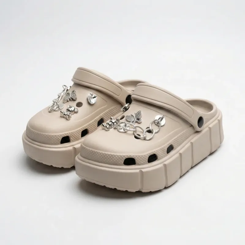 Додайте блиску своєму літньому образу з цією неймовірною парою кроксів на платформі! Ця модель — ідеальне поєднання комфорту класичних сабо та найгарячіших модних трендів. Висока підошва візуально подовжує ноги, не обтяжуючи їх, адже взуття виготовлене з легкого матеріалу EVA. Головна "фішка" моделі — ексклюзивний декор: Верх взуття прикрашений стильними сріблястими ланцюжками, що додають образу гранжу та зухвалості. Композицію доповнюють блискучі джибітси у формі метеликів, ведмедиків та камінців, які переливаються на сонці. Ніжний бежевий (молочний) колір є універсальним і пасує під будь-який літній одяг: від джинсових шортів до легких суконь. Зручний п'ятковий ремінець дозволяє носити їх як шльопанці або фіксувати на нозі як сандалі. Ідеальний вибір для прогулянок містом, пляжу або яскравих фотосесій. Характеристики: Розміри: 37, 38, 39, 40, 41 Колір: Бежевий / Молочний Матеріал: Піна (EVA) — легкі та водостійкі Підошва: Висока платформа Декор: Знімні прикраси (ланцюги, фігурки, стрази) сріблястого кольору Сезон: Літо