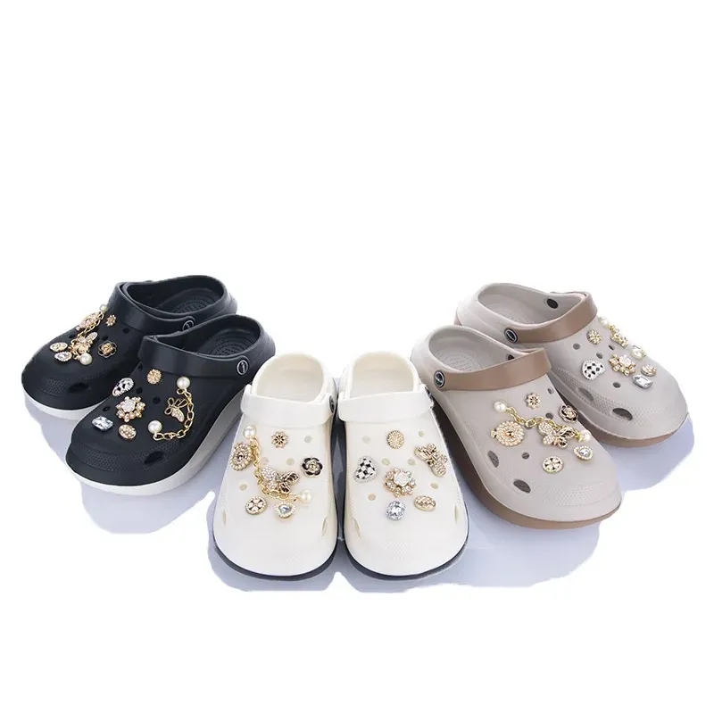 Шукаєте взуття, яке поєднує комфорт кроксов та вишуканий стиль? Зверніть увагу на цю ексклюзивну модель жіночих сабо на платформі. Вони виготовлені з високоякісної піни ЕВА (EVA), що забезпечує неймовірну легкість та амортизацію при ходьбі. Висока підошва візуально видовжує ноги та додає образу сучасності. Головна особливість цієї моделі — розкішний декор. Сабо прикрашені стильними джибітсами у вигляді перлин, блискучих кристалів, квітів та золотих ланцюжків. Це ідеальний вибір для прогулянок містом, пляжних вечірок або як ефектне змінне взуття для роботи (б'юті-майстри, адміністратори). Ремінець п'яти надійно фіксує ногу, а вентиляційні отвори дарують комфорт у спеку. Характеристики: Матеріал: Піна ЕВА (EVA) — легка, гіпоалергенна Підошва: Платформа (висока, стійка) Декор: Джибітси (стрази, перли, ланцюжки, квіти) — знімні Кольори: Чорний, Білий (Молочний), Бежевий Сезон: Літо / Весна Розмірна сітка: 36-41