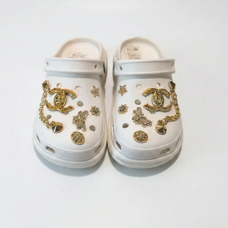 Зустрічайте справжній хіт цього літа! Представляємо неймовірно стильні жіночі крокси (сабо) у білосніжному кольорі, які перевертають уявлення про класичне літнє взуття. Головна фішка цієї моделі — розкішний золотий декор (джибітси) у вигляді масивного ланцюжка, стильного логотипа, бджілок та зірочок зі стразами. Це ідеальний вибір для дівчат та жінок, які хочуть поєднати абсолютний комфорт із гламурним та трендовим зовнішнім виглядом!