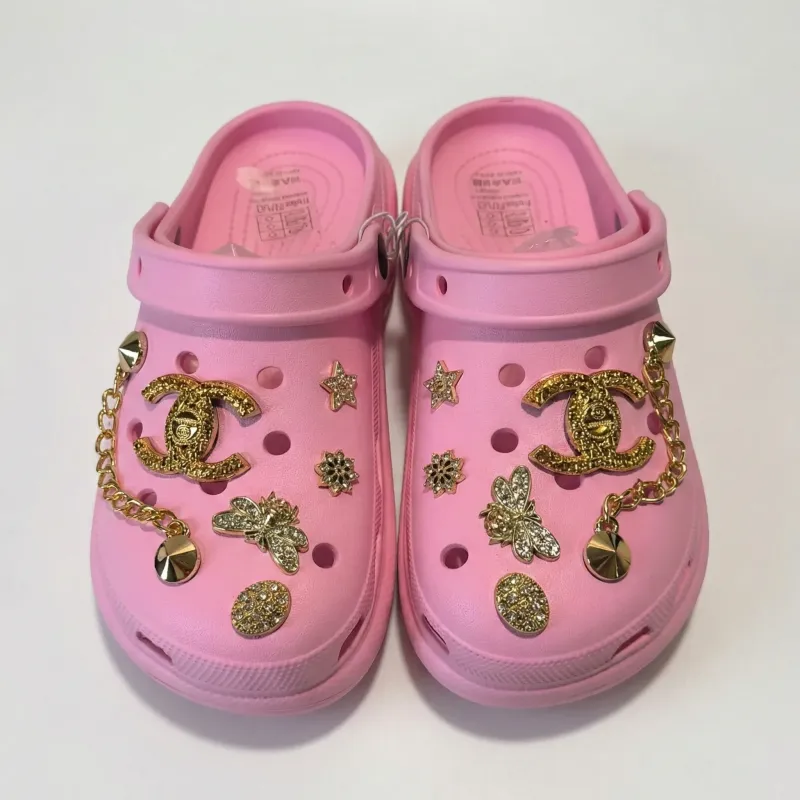 Додайте яскравих барв у своє літо! Представляємо абсолютний хіт сезону — неймовірно стильні та гламурні жіночі крокси (сабо) у ніжному рожевому кольорі. Головна фішка цієї моделі — багатий золотий декор (джибітси), що включає масивний ланцюжок, логотип у стилі відомого бренду, бджілок та зірочки зі стразами. Це ідеальне взуття для дівчат, які обожнюють бути в центрі уваги та хочуть поєднати максимальний комфорт із трендовим стилем!