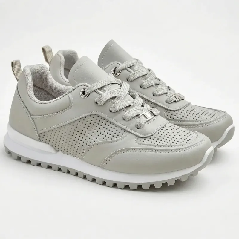 Шукаєте стильну та універсальну пару на кожен день? Ці жіночі кросівки у світло-сірому кольорі — ідеальна база для вашого гардеробу. Дизайн натхненний класичними ретро-моделями, які завжди в моді. Верх виготовлений з якісної м'якої еко-шкіри, яка приємна на дотик і легко чиститься. Головна перевага моделі — активна перфорація (дірочки) на носку та з боків. Це забезпечує відмінну вентиляцію, дозволяючи ногам "дихати" навіть у теплу погоду. Біла підошва з рельєфним протектором гарантує стійкість та комфорт при ходьбі. Кросівки мають акуратну шнурівку в тон та стильний металевий декор на шнурках. Чудово пасують до джинсів, суконь та спортивного одягу. Характеристики: Матеріал верху: Еко-шкіра (з перфорацією) Матеріал підошви: ПВХ/Гума (зубастий протектор) Колір: Світло-сірий (з теплим підтоном) Застібка: Шнурівка Сезон: Весна / Літо / Тепла осінь Розмірна сітка: 36-41