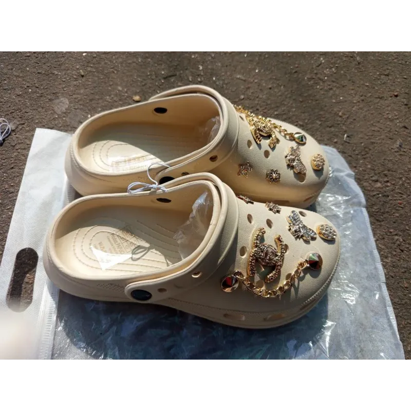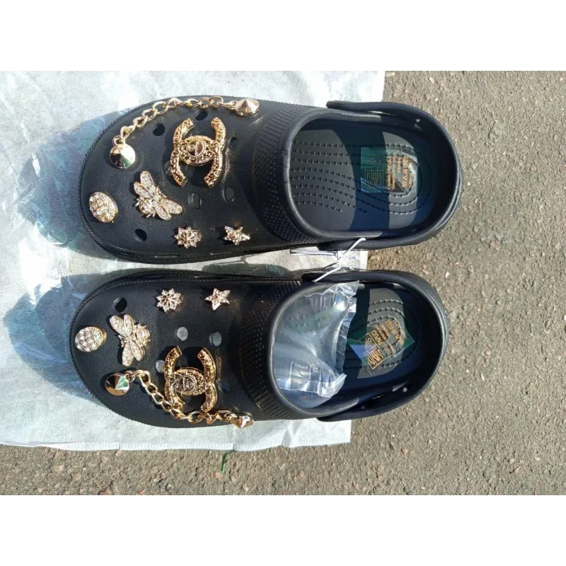 Елегантні чорні сабо з золотими прикрасами (джибітсами) та масивним ланцюжком. Практичний колір, легка підошва EVA. Хіт сезону. Розміри 36-41. Повний опис: Якщо ви шукаєте взуття, яке поєднує максимальний комфорт та розкішний вигляд, ці чорні сабо — ваш ідеальний вибір. Глибокий чорний колір створює ідеальний фон для золотого декору, змушуючи його сяяти ще яскравіше. Ця модель не лише красива, а й мега-практична. На чорному кольорі менш помітний пил, тому вони ідеально підходять для щоденного носіння містом, на дачі чи пікніку. Переваги моделі: Стиль "Black & Gold": Класичне поєднання чорного та золотого виглядає дорого і пасує майже до будь-якого одягу. Практичність: Менш мазкі, ніж білі аналоги, легко миються водою. Комфорт: Пружний матеріал EVA амортизує кроки, знімаючи втому з ніг. Характеристики: Тип: Сабо / Крокси Матеріал: Піна (EVA) Колір: Чорний Декор: Золотистий ланцюг, фігурні джибітси (знімні) Розміри: 36-41