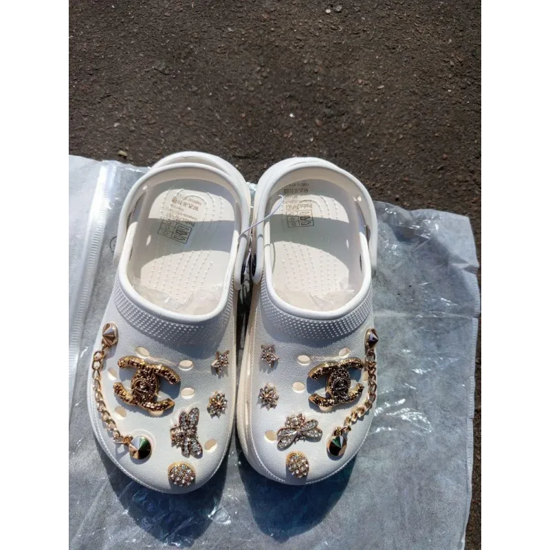 Стильні білі сабо на літо. Прикрашені золотистими джибітсами (лого, бджілки, зірки) та ланцюжком. Легкий матеріал EVA. Розміри 36-41. Повний опис: Ці білі жіночі сабо створені для тих, хто хоче поєднати комфорт кроксов із вишуканим стилем. Модель виконана з легкого та м'якого пінистого матеріалу (EVA), який амортизує при ходьбі та легко миється. Головна "фішка" моделі — розкішний декор. Золотистий ланцюжок та набір стильних джибітсів (камінці, бджілки, логотипи) перетворюють звичайні шльопанці на модний аксесуар, який круто виглядає і на пляжі, і на прогулянці в місті. Особливості: Ефектний дизайн: Білий колір ідеально підкреслює засмагу, а золото додає статусності. Зручність: Поворотний ремінець фіксує п'яту, щоб взуття не злітало. Практичність: Отвори забезпечують вентиляцію, нога не пітніє. Характеристики: Тип: Сабо / Крокси Матеріал: Піна (EVA) Колір: Білий Декор: Золотий ланцюжок, джибітси (знімні) Сезон: Літо / Басейн / Дім Розміри в наявності: 36, 37, 38, 39, 40, 41