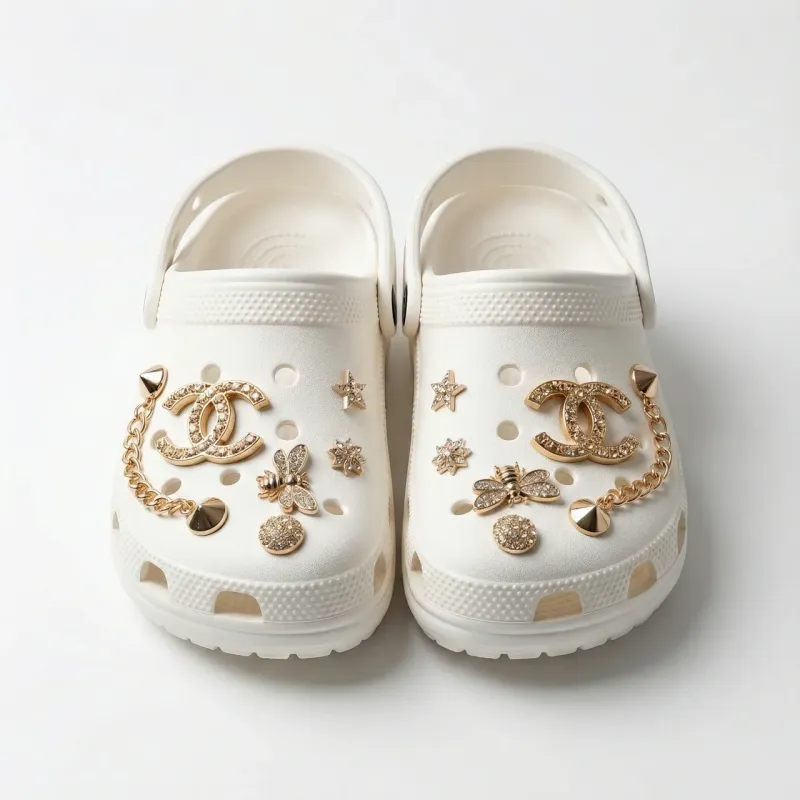 Стильні білі сабо на літо. Прикрашені золотистими джибітсами (лого, бджілки, зірки) та ланцюжком. Легкий матеріал EVA. Розміри 36-41. Повний опис: Ці білі жіночі сабо створені для тих, хто хоче поєднати комфорт кроксов із вишуканим стилем. Модель виконана з легкого та м'якого пінистого матеріалу (EVA), який амортизує при ходьбі та легко миється. Головна "фішка" моделі — розкішний декор. Золотистий ланцюжок та набір стильних джибітсів (камінці, бджілки, логотипи) перетворюють звичайні шльопанці на модний аксесуар, який круто виглядає і на пляжі, і на прогулянці в місті. Особливості: Ефектний дизайн: Білий колір ідеально підкреслює засмагу, а золото додає статусності. Зручність: Поворотний ремінець фіксує п'яту, щоб взуття не злітало. Практичність: Отвори забезпечують вентиляцію, нога не пітніє. Характеристики: Тип: Сабо / Крокси Матеріал: Піна (EVA) Колір: Білий Декор: Золотий ланцюжок, джибітси (знімні) Сезон: Літо / Басейн / Дім Розміри в наявності: 36, 37, 38, 39, 40, 41