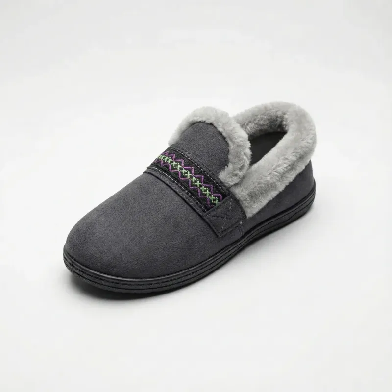 Неймовірно м'які та теплі жіночі кімнатні тапочки, які зігріють ваші ніжки у холодну пору року. Модель виконана у практичному темно-сірому кольорі з м'якого текстилю, що імітує замшу, та прикрашена стильною етнічною вишивкою. Густа хутряна облямівка світло-сірого кольору не лише додає затишку, а й надійно утримує тепло всередині. Закритий фасон типу "чуні" забезпечує максимальний комфорт та захист від протягів. Підошва виготовлена з міцного та гнучкого матеріалу (ПВХ/Гума), має рельєфний візерунок, що запобігає ковзанню по плитці, паркету чи ламінату. Тапочки легкі, не обтяжують ногу та дарують відчуття повного розслаблення після важкого робочого дня. Переваги: Тепло: Густе штучне хутро всередині забезпечує чудову терморегуляцію. Дизайн: Акуратна вишивка та пухнастий відворот виглядають дуже стильно. Зручність: М'яка устілка та гнучка підошва для комфортної ходьби. Характеристики: Тип: Закриті тапочки / Чуні Матеріал верху: Текстиль (під замшу) Утеплювач: Штучне хутро Підошва: Протиковзка (ПВХ) Розміри: 36-41 Сезон: Осінь / Зима