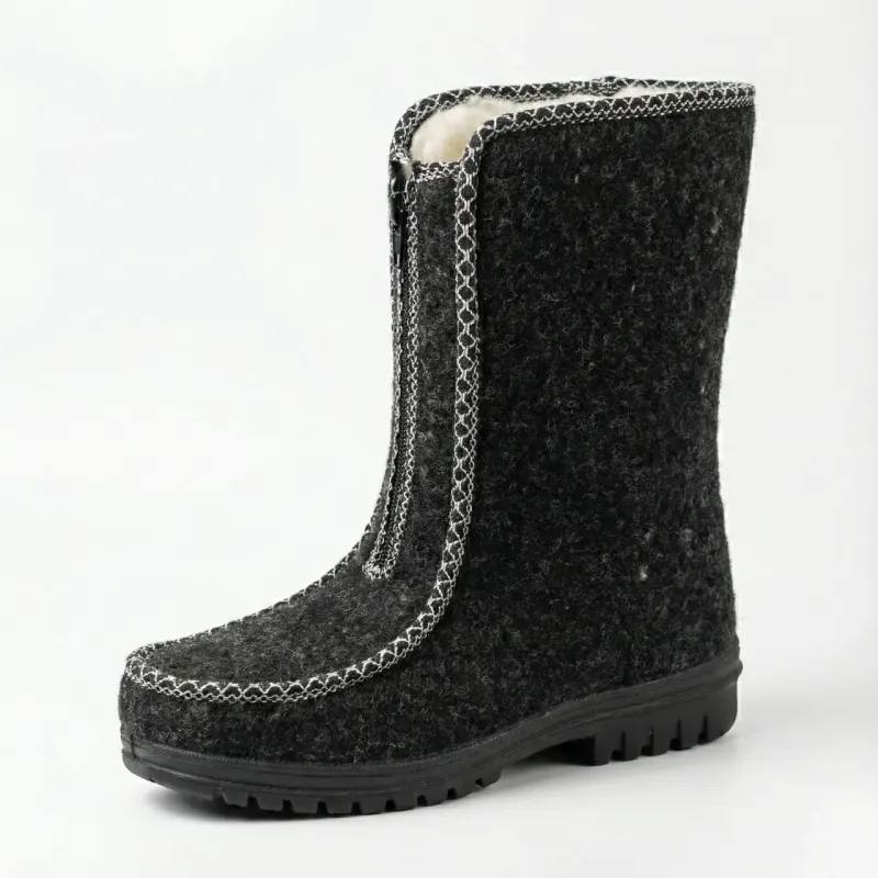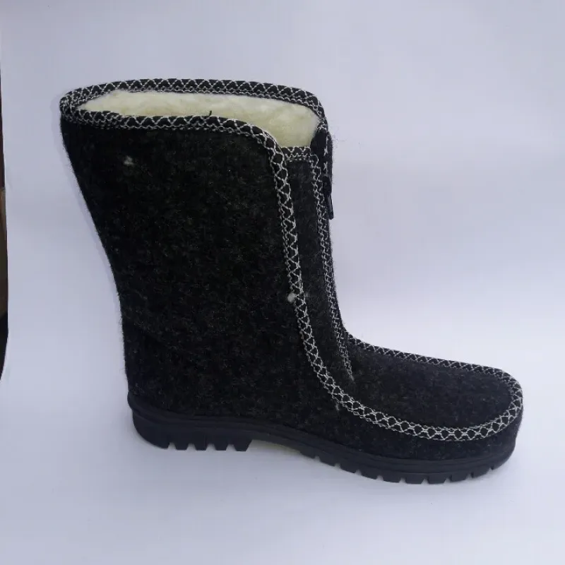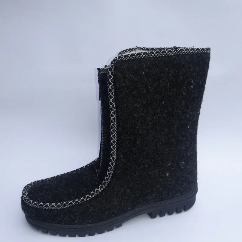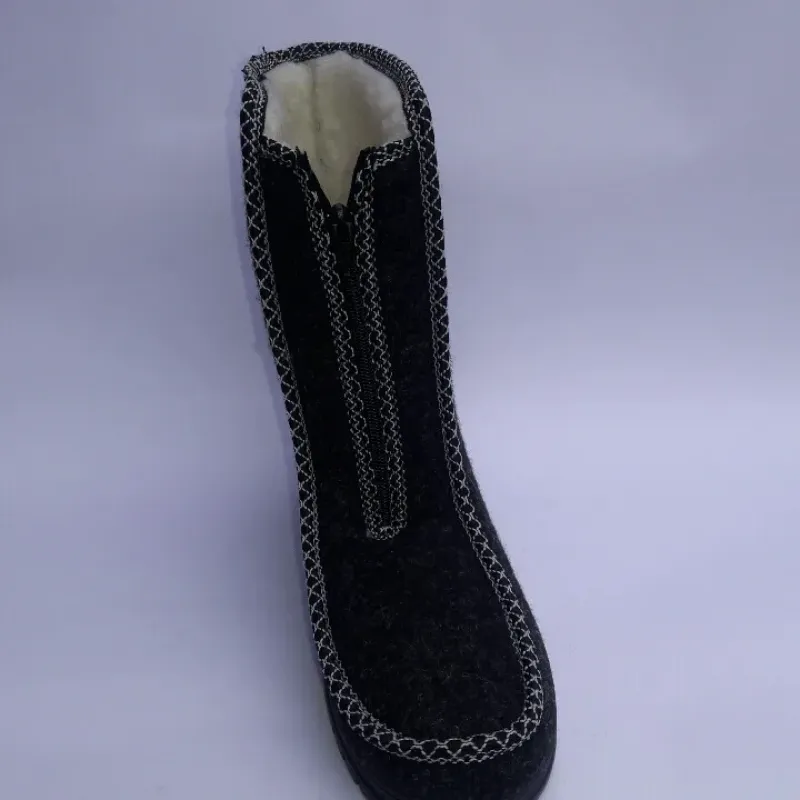 Класичні жіночі зимові бурки, які поєднують в собі перевірений часом комфорт та надійний захист від холоду. Верх взуття виготовлений із щільного нетканого матеріалу (сукно/повсть), який дозволяє ногам "дихати", зберігаючи при цьому сухе тепло. Модель прикрашена акуратною декоративною строчкою білого кольору, що додає взуттю виразності. Головна перевага цієї моделі — блискавка, розташована по центру. Це найбільш зручний варіант застібки для людей з високим підйомом або набряклими ногами, оскільки дозволяє взуватися без зайвих зусиль. Всередині чобітки густо утеплені штучним хутром (світла овчина). Підошва лита, виготовлена з ПВХ, має рифлену поверхню для стійкості на снігу. Це ідеальний варіант для сухої морозної погоди, роботи в прохолодних приміщеннях або як домашнє взуття у приватному секторі. Характеристики: Матеріал верху: Повсть (сукно) — м'який та теплий. Утеплювач: Густе штучне хутро. Застібка: Блискавка по центру (легке взування). Підошва: ПВХ (висока ізоляція). Колір: Чорний (з білою строчкою). Сезон: Зима. Розмірний ряд: 37-42.