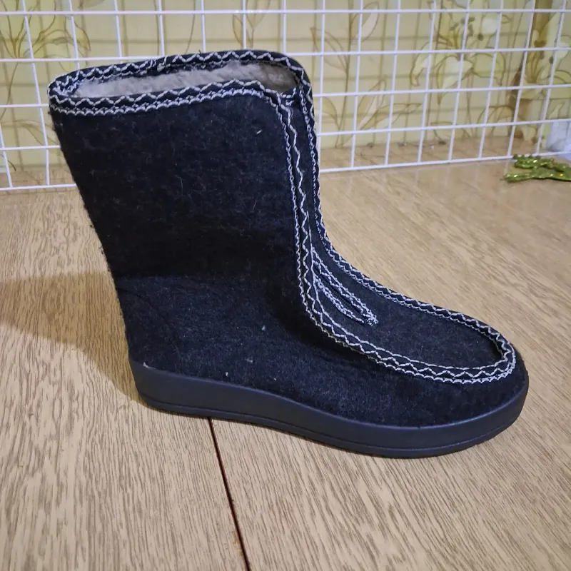 Класичні зимові бурки — це еталон тепла та домашнього затишку для ваших ніг. Ця модель ідеально підходить для літніх людей, а також для тих, хто працює в холодних приміщеннях або живе у приватному будинку. Верх виготовлений із щільного натурального сукна (повсті), яке дозволяє ногам "дихати", але при цьому надійно утримує тепло всередині. Черевики утеплені густим штучним хутром по всій внутрішній поверхні. Головна перевага моделі — зручна застібка-блискавка спереду ("змійка"), яка дозволяє легко взуватися людям з високим підйомом або набряклими ногами, не нахиляючись зайвий раз. Акуратна декоративна прострочка білою ниткою додає взуттю охайного вигляду. Лита підошва з ПВХ досить висока, щоб захистити від холодної підлоги, і має рифлений протектор для стійкості. Це взуття легке, м'яке і не сковує рухів. Характеристики: Сезон: Зима Матеріал верху: Сукно (Повсть) Матеріал підкладки: Штучне хутро Застібка: Блискавка спереду Підошва: ПВХ (протиковзка) Колір: Чорний (з білою строчкою) Розміри: 36-42
