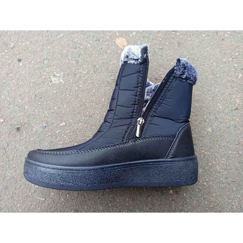 Забудьте про складне взування та холодні ноги! Ці жіночі зимові черевики створені спеціально для тих, хто цінує максимальний комфорт і тепло. Модель виконана в універсальному чорному кольорі та поєднує в собі практичність "дутиків" з елегантністю міських черевиків. Головні переваги моделі: Легке взування (2 блискавки): Унікальна конструкція з двома робочими блискавками з боків дозволяє максимально широко розкрити чобіт. Це справжній порятунок для жінок з високим підйомом або широкою стопою. Тепло та затишок: Всередині черевики щедро утеплені густим штучним хутром (сіро-чорного кольору), яке виступає опушкою по верхньому краю. Воно м'яке, приємне на дотик і чудово зігріває в мороз. Практичні матеріали: Верх виготовлено з водовідштовхувальної плащівки, а низ (по контуру стопи) посилено вставкою з еко-шкіри. Це захищає взуття від промокання у слякоть та подовжує термін служби. Зручна підошва: Товста підошва з ромбовидним протектором надійно ізолює стопу від холодної землі та забезпечує стійкість на зимових дорогах. Характеристики: Сезон: Зима Тип: Дутики / Короткі черевики Матеріал верху: Текстиль (плащівка) + Еко-шкіра Утеплювач: Штучне хутро Застібка: Дві блискавки (зліва та справа) Підошва: ПВХ (прошита/клеєна) Колір: Чорний Розміри: 37, 38, 39, 40, 41, 42