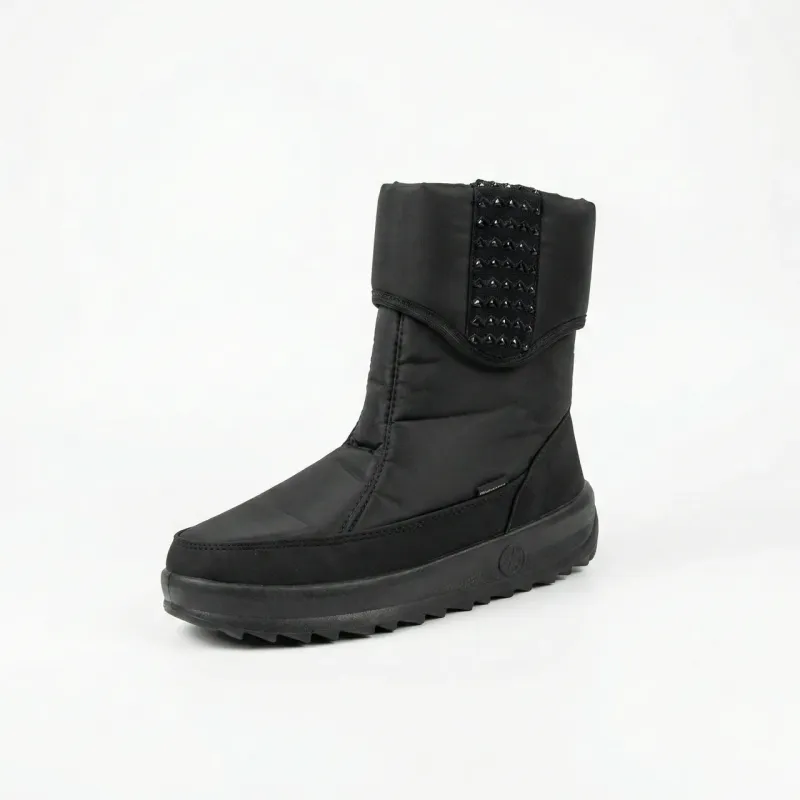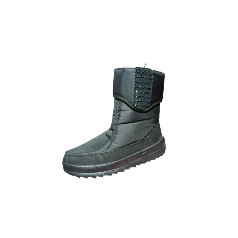 Ці високі чорні дутики доводять, що зимове взуття може бути не лише теплим, а й вишуканим. Модель ідеально підійде під шубу, пуховик або пальто, додаючи образу нотку гламуру. Верх виготовлений з якісного водовідштовхувального текстилю, який не боїться мокрого снігу. Головна прикраса моделі — широкий відворот, декорований вставкою з чорними сяючими елементами (стразами), що мерехтять на світлі. Висока підошва захищає від холоду, а анатомічна форма забезпечує комфорт протягом усього дня. Всередині — щільне хутро, яке огортає ноги теплом. Характеристики: Тип: Високі дутики / Чоботи. Сезон: Зима. Колір: Чорний (Black). Декор: Вставка зі стразами/камінням. Матеріал верху: Плащівка + Еко-шкіра (окантовка). Підошва: Потовщена, нековзна.