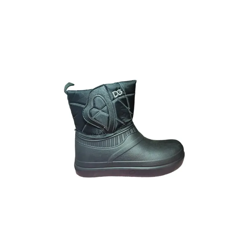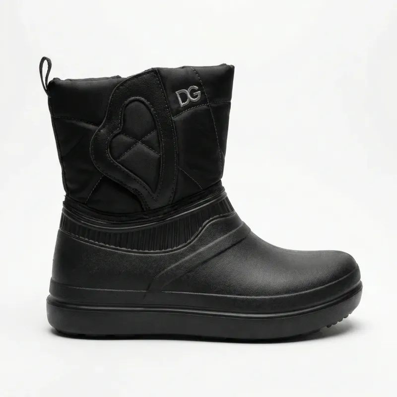 Ці чорні зимові сноубутси — справжній порятунок у вологу та сніжну погоду. Вони поєднують у собі герметичність гумових чобіт та тепло зимових дутиків. Нижня частина виготовлена із сучасного матеріалу EVA (пінка), який не пропускає воду, дуже легкий та не промерзає так, як звичайна гума. Верхня частина — щільний водовідштовхувальний текстиль з декоративною вишивкою у вигляді серця та стильною абревіатурою "DG". Суцільна лита підошва гарантує сухість ніг навіть у глибоких калюжах. Це ідеальний вибір для прогулянок у відлигу або для господарських справ. Ззаду є зручна петелька для легкого взування. Характеристики: Тип: Сноубутси / Дутики-галоші. Сезон: Зима / Мокра осінь / Весна. Колір: Чорний (Black). Матеріал низу: EVA (пінка) — 100% захист від води. Матеріал верху: Текстиль. Декор: Вишивка, логотип DG.