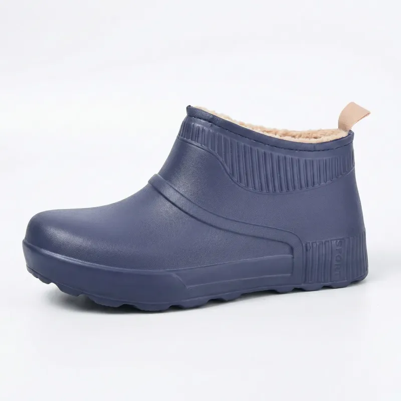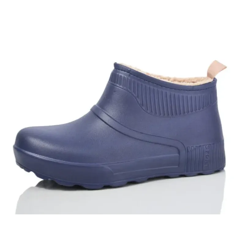 Стильні та яскраві жіночі галоші з піни ЕВА — це ідеальне рішення для мокрої та холодної погоди. Ця модель поєднує в собі легкість, практичність та сучасний дизайн. Вони незамінні для прогулянок у дощ, сльоту, роботи на городі або просто як тепле повсякденне взуття для приватного сектору. Взуття виготовлене з сучасного матеріалу ЕВА, який є повністю водонепроникним та відмінно зберігає тепло. На відміну від звичайної гуми, ці чобітки майже невагомі, тому ноги не втомлюються навіть після тривалої ходьби. Всередині передбачений густий шар штучного хутра (світлого кольору), який забезпечує комфорт та зігріває при низьких температурах. Модель має зручну низьку посадку (напівчеревики), що дозволяє легко та швидко взуватися без використання рук. Еластичний верх добре прилягає до ноги, а рельєфна підошва запобігає ковзанню. На п'яті розміщено стильний напис "SPORT", що додає взуттю акуратного вигляду. Характеристики: Матеріал верху: Піна ЕВА (вологостійка, морозостійка) Утеплювач: Штучне хутро (незнімне) Сезон: Осінь / Зима / Весна Колір: Синій / Фіолетовий (Індиго) Особливості: Легкі, водонепроникні, напис "SPORT" Призначення: Сад, город, прогулянки, дощова погода Країна виробник: Україна