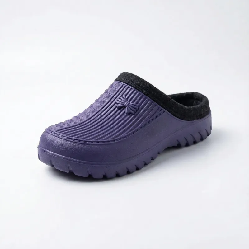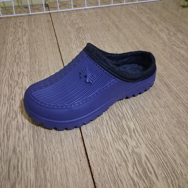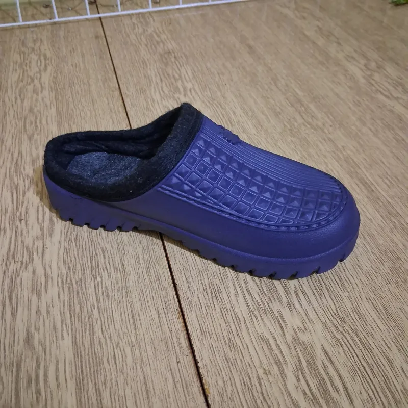 Яскраві та практичні жіночі сабо, які стануть незамінним взуттям для приватного будинку, дачі або роботи в прохолодних приміщеннях. Модель виконана в красивому фіолетовому кольорі та прикрашена акуратним литим бантиком, що додає взуттю жіночності. Основа виготовлена з легкого та водонепроникного матеріалу ЕВА (піна), який надійно захищає ноги від вологи, бруду та сльотавої погоди. Матеріал залишається еластичним навіть при мінусових температурах. Всередині галоші мають теплий вшитий утеплювач темного кольору (штучна повсть/хутро), який відмінно зберігає тепло і, на відміну від світлого хутра, є дуже практичним та немарким у використанні. Це взуття легко взувається завдяки відкритій п'яті та закритому носку. Підошва має рельєфний малюнок для стійкості на слизьких поверхнях. Галоші дуже прості у догляді — достатньо промити їх водою. Характеристики: Сезон: Зима / Осінь / Весна Матеріал верху: Піна ЕВА (водовідштовхувальна) Утеплювач: Штучна повсть/хутро (темний, немаркий) Колір: Фіолетовий (Синій) Декор: Бантик Розміри: 36-41 Призначення: Дім, сад, город, робота