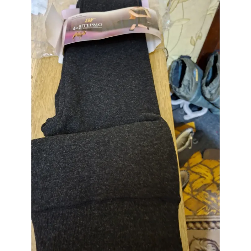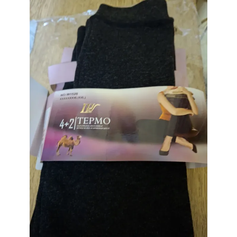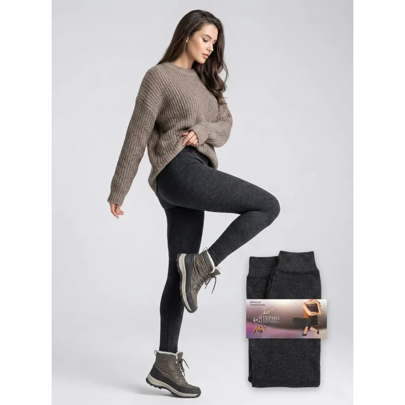Зігрійтеся навіть у найлютіші морози з нашими супер-теплими лосинами серії "TERMO". Це ідеальний вибір для тих, хто цінує максимальний комфорт і тепло. Модель позиціонується як виріб з доданням "верблюжої вовни" (про що свідчить емблема на упаковці), що гарантує відмінне збереження тепла тіла. Чому ці лосини — кращий вибір на зиму: Густе хутро: Всередині лосини утеплені товстим шаром щільного, м'якого хутра чорного кольору. Це найтепліший варіант, який можна знайти. Розмір Батал: На етикетці вказано розмір 8XL. У реальності це повноцінний Plus Size (орієнтовно на українські розміри 50-56/58), який м'яко сідає на пишні форми, не перетискаючи та не скочуючись. Практичність: Зовнішня тканина має приємну трикотажну фактуру в кольорі "мокрий асфальт" (темно-сірий меланж). Вона еластична, зносостійка та не кошлатиться. Комфорт: Широкий пояс та висока посадка надійно захищають поперек від холоду. Безшовна технологія (або плоскі шви) забезпечує зручність при носінні під одягом. Характеристики: Тип: Термолосини (Гамаші) Серія: 4+2 TERMO / Camel Wool Розмір: Батал (Маркування 8XL, йде на 50-56+) Колір: Темно-сірий (Антрацит) Утеплювач: Штучне хутро (дуже щільне) Сезон: Глибока зима
