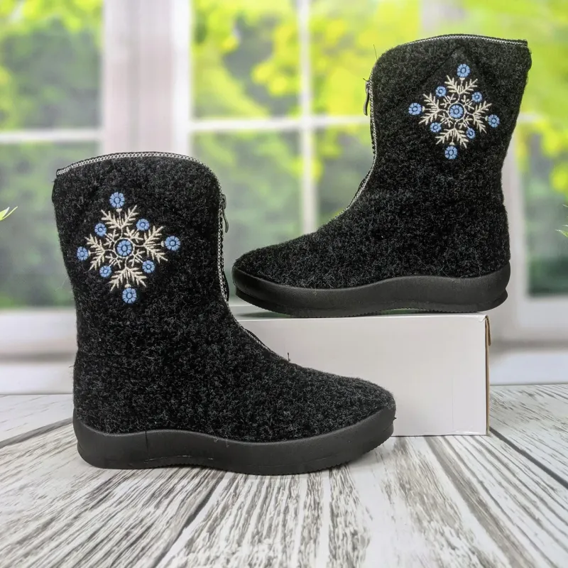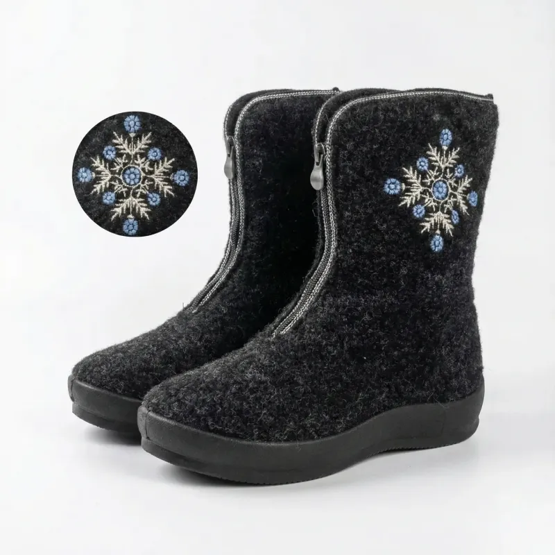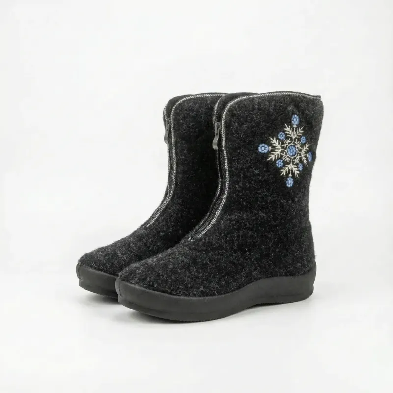 Дуже теплі та затишні жіночі зимові чобітки (бурки), виготовлені з щільного натурального повсті (войлоку). Ця модель ідеально підходить для сухих морозних днів. Головна перевага — застібка-блискавка, розташована спереду. Це максимально спрощує процес взування, що особливо важливо для людей з високим підйомом ноги або для літніх людей. Чобітки прикрашені акуратною вишивкою "Сніжинка", що надає їм привабливого вигляду. Всередині взуття утеплене густим штучним хутром (світлого кольору), яке чудово акумулює тепло. Підошва висока, виготовлена зі спіненого ПВХ або поліуретану, що забезпечує легкість ходи та ізоляцію від холодної землі. Це найкращий подарунок для мами чи бабусі, а також чудовий варіант змінного взуття для роботи в холодних приміщеннях. Характеристики: Матеріал верху: Повсть (войлок) — дихаючий та теплий матеріал. Утеплювач: Штучне хутро (набивна овчина). Застібка: Блискавка спереду (зручний вхід). Дизайн: Вишивка "Блакитна сніжинка". Підошва: Лита, легка, зносостійка. Колір: Чорний / Темно-сірий. Сезон: Зима. Розмірний ряд: 36-42.