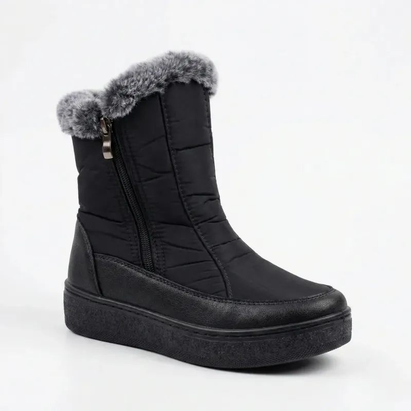 Забудьте про складне взування та холодні ноги! Ці жіночі зимові черевики створені спеціально для тих, хто цінує максимальний комфорт і тепло. Модель виконана в універсальному чорному кольорі та поєднує в собі практичність "дутиків" з елегантністю міських черевиків. Головні переваги моделі: Легке взування (2 блискавки): Унікальна конструкція з двома робочими блискавками з боків дозволяє максимально широко розкрити чобіт. Це справжній порятунок для жінок з високим підйомом або широкою стопою. Тепло та затишок: Всередині черевики щедро утеплені густим штучним хутром (сіро-чорного кольору), яке виступає опушкою по верхньому краю. Воно м'яке, приємне на дотик і чудово зігріває в мороз. Практичні матеріали: Верх виготовлено з водовідштовхувальної плащівки, а низ (по контуру стопи) посилено вставкою з еко-шкіри. Це захищає взуття від промокання у слякоть та подовжує термін служби. Зручна підошва: Товста підошва з ромбовидним протектором надійно ізолює стопу від холодної землі та забезпечує стійкість на зимових дорогах. Характеристики: Сезон: Зима Тип: Дутики / Короткі черевики Матеріал верху: Текстиль (плащівка) + Еко-шкіра Утеплювач: Штучне хутро Застібка: Дві блискавки (зліва та справа) Підошва: ПВХ (прошита/клеєна) Колір: Чорний Розміри: 37, 38, 39, 40, 41, 42