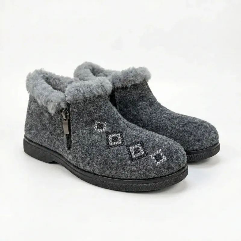 Подаруйте своїм ніжкам тепло та затишок з нашими зимовими жіночими чунями! Це ідеальне рішення для холодних квартир та приватних будинків. Модель виконана у вигляді акуратних напівчеревиків сірого кольору, прикрашених стильною геометричною вишивкою. Верх виготовлено з щільного нетканого матеріалу (текстиль під повсть), який чудово зберігає тепло. Всередині чуні повністю утеплені густим штучним хутром, яке створює ефект "сухого тепла" і не дає ногам мерзнути навіть у сильні морози. Головна перевага цієї моделі — наявність зручної блискавки збоку, що дозволяє легко взувати та знімати їх людям будь-якого віку, навіть із високим підйомом стопи. Підошва лита, виготовлена з міцного ПВХ. Вона не ковзає, досить гнучка і дозволяє використовувати це взуття не тільки в приміщенні, але й виходити на вулицю (наприклад, у двір приватного будинку). Це чудовий варіант подарунка для близьких, про яких ви хочете подбати. Характеристики: Матеріал верху: Щільний текстиль (сукно/фетр) Матеріал підкладки: Штучне хутро Підошва: ПВХ (для дому та вулиці) Застібка: Блискавка Колір: Темно-сірий з вишивкою Розміри: 37, 38, 39, 40, 41 Країна виробник: Україна Сезон: Зима / Холодна осінь