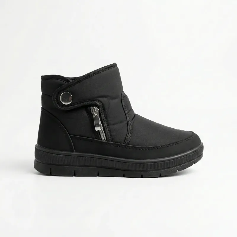 Ці короткі чорні дутики — ідеальний вибір для активних жінок, які цінують швидкість та комфорт. Низька висота (по кісточку) робить їх надзвичайно зручними для щоденного носіння, водіння авто або довгих піших прогулянок. Верх виконаний з комбінації водовідштовхувального текстилю та захисної окантовки, що береже взуття від сльоти. Збоку розташована надійна блискавка з металевим бігунком, а стильний відворот прикрашений декоративною металевою кнопкою, що додає моделі родзинку. Всередині черевики утеплені густим хутром, яке виглядає з-під краю, створюючи додатковий затишок. Гнучка чорна підошва забезпечує надійне зчеплення з поверхнею. Характеристики: Тип: Короткі дутики / Черевики. Сезон: Зима / Холодна осінь. Колір: Чорний (Black). Застібка: Блискавка + Декоративна кнопка. Матеріал верху: Плащівка / Еко-матеріали. Утеплювач: Штучне хутро.