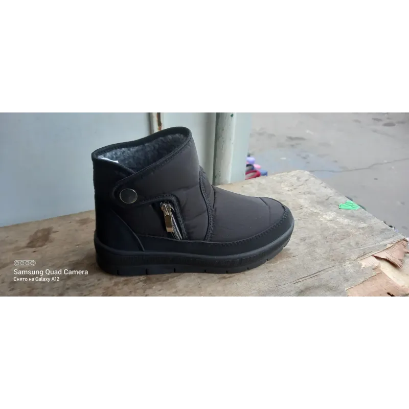 Ці короткі чорні дутики — ідеальний вибір для активних жінок, які цінують швидкість та комфорт. Низька висота (по кісточку) робить їх надзвичайно зручними для щоденного носіння, водіння авто або довгих піших прогулянок. Верх виконаний з комбінації водовідштовхувального текстилю та захисної окантовки, що береже взуття від сльоти. Збоку розташована надійна блискавка з металевим бігунком, а стильний відворот прикрашений декоративною металевою кнопкою, що додає моделі родзинку. Всередині черевики утеплені густим хутром, яке виглядає з-під краю, створюючи додатковий затишок. Гнучка чорна підошва забезпечує надійне зчеплення з поверхнею. Характеристики: Тип: Короткі дутики / Черевики. Сезон: Зима / Холодна осінь. Колір: Чорний (Black). Застібка: Блискавка + Декоративна кнопка. Матеріал верху: Плащівка / Еко-матеріали. Утеплювач: Штучне хутро.