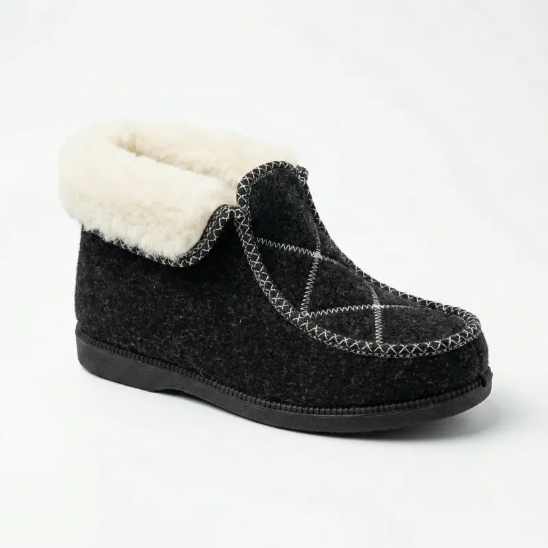 Подаруйте тепло своїм близьким з цими затишними зимовими чунями! Це найпростіша та найнадійніша модель для дому та господарства. Вони ідеально підходять для тих, хто живе у приватному будинку, або для холодних квартир як дуже теплі капці. Чому ця модель така популярна: Максимальна простота: Тут немає блискавок, шнурків чи липучок. Завдяки широкому входу нога просто "проковзує" всередину. Це ідеальний варіант для літніх людей, яким важко нахилятися. Дуже теплі: Всередині чуні густо набиті м'яким білим штучним хутром, яке виглядає як овчина. Хутряна опушка зверху додатково зігріває щиколотку. М'які та зручні: Верх виконано з м'якого чорного текстилю (фетр/сукно), прикрашеного контрастною білою строчкою. Взуття не давить і не натирає. Універсальна підошва: Лита підошва з ПВХ дозволяє виходити в них на вулицю (наприклад, у двір), вона не промокає і не ковзає на плитці. Це найкращий бюджетний подарунок для мами чи бабусі, який покаже вашу турботу. Характеристики: Сезон: Зима / Холодна осінь Тип: Чуні / Капці-чобітки Матеріал верху: Текстиль (сукно) Утеплювач: Штучне хутро (біле) Підошва: ПВХ Застібка: Відсутня (сліпони) Колір: Чорний Розміри: 37, 38, 39, 40, 41