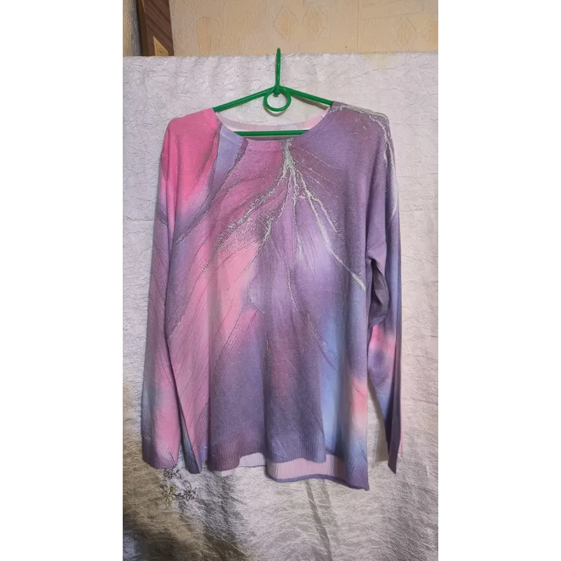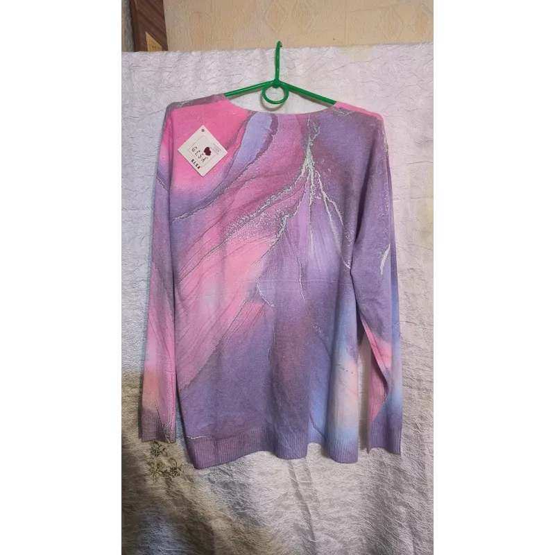 Неймовірно красивий та художній жіночий джемпер від бренду G.L.S.A. Головна особливість цієї моделі — заворожуючий абстрактний принт, що нагадує техніку "Fluid Art" (рідкий акрил) або візерунок натурального мармуру. Плавні переходи рожевого, бузкового, фіолетового та блакитного кольорів створюють свіжий та романтичний образ. Лінії візерунка делікатно підкреслені дрібним напиленням або стразами, що додає виробу легкого мерехтіння. Джемпер має класичний круглий виріз та довгі рукави. Тканина м'яка, приємна на дотик, добре тягнеться та сідає по фігурі. Це чудовий варіант, щоб додати барв у повсякденний гардероб або створити ефектний святковий лук. Характеристики: Виробник: G.L.S.A Тип виробу: Джемпер / Светр / Кофта Колір: Мультиколор (Рожевий / Фіолетовий / Блакитний) Принт: Абстракція / Мармур Декор: Блискуче напилення / Стрази Рукав: Довгий Сезон: Весна / Осінь / Зима Стан: Новий