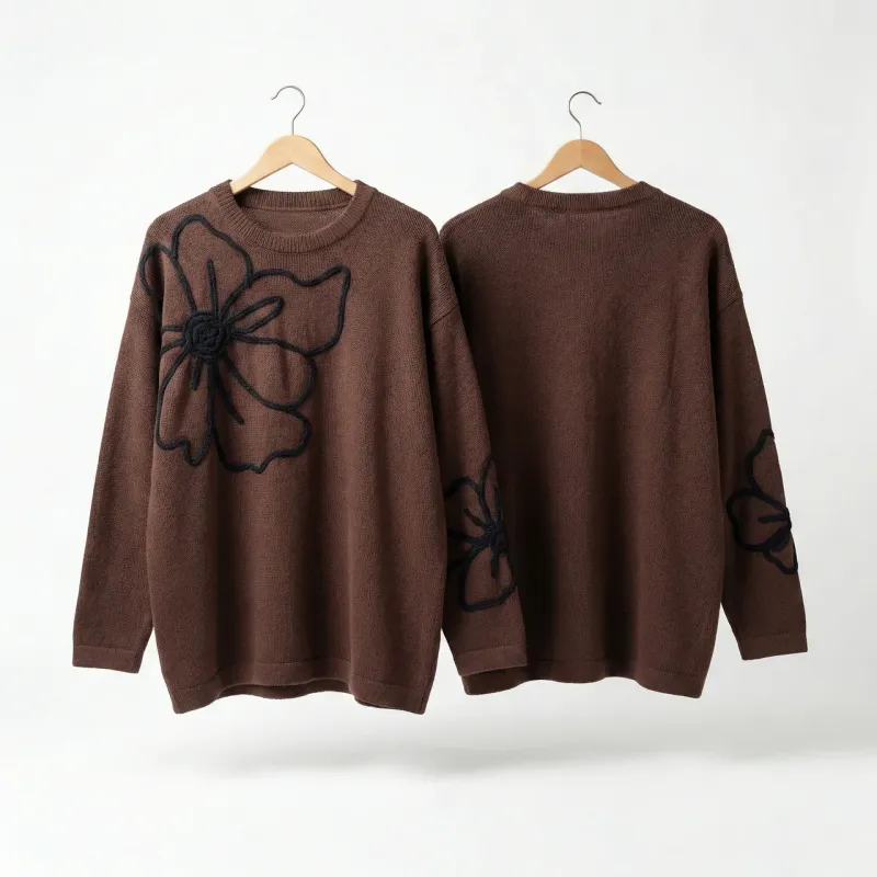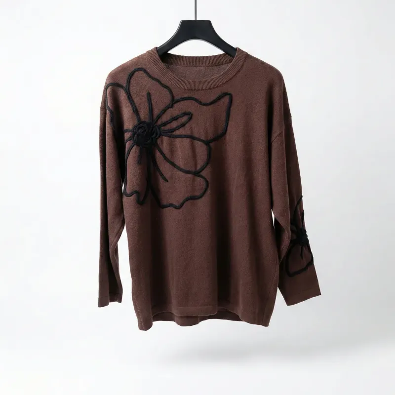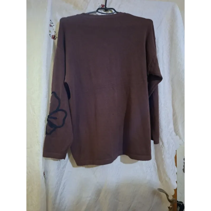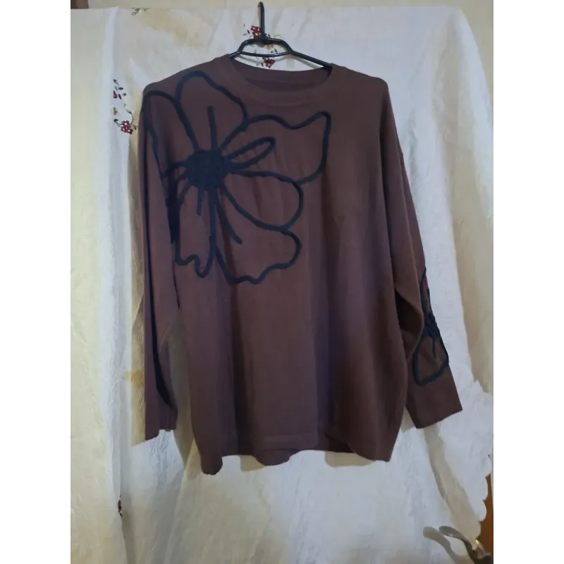 Оновіть свій повсякденний гардероб стильним та затишним светром виробництва Туреччини. Ця модель у глибокому коричневому (шоколадному) кольорі стане вашою улюбленою річчю в прохолодну погоду. Виріб виконаний з м'якого, приємного до тіла трикотажу, який відмінно тягнеться та зберігає форму. Головна особливість моделі — оригінальний декор. Передню частину прикрашає великий чорний контур квітки, що додає образу виразності та сучасності. Додатковий акцент зроблено на рукаві, де також розміщено стильний візерунок. Спинка виробу однотонна, лаконічна. Завдяки вільному крою (оверсайз) та універсальному розміру (підходить на 48, 50, 52), туніка гарно сідає на будь-яку фігуру, приховуючи дрібні недоліки. Її можна комбінувати як з джинсами, так і з класичними брюками або лосинами. Характеристики: Країна виробник: Туреччина Розмір: Універсальний (48-52) Колір: Коричневий Декор: Аплікація "Квітка" (на грудях та рукаві) Матеріал: М'який трикотаж Сезон: Весна / Осінь / Зима